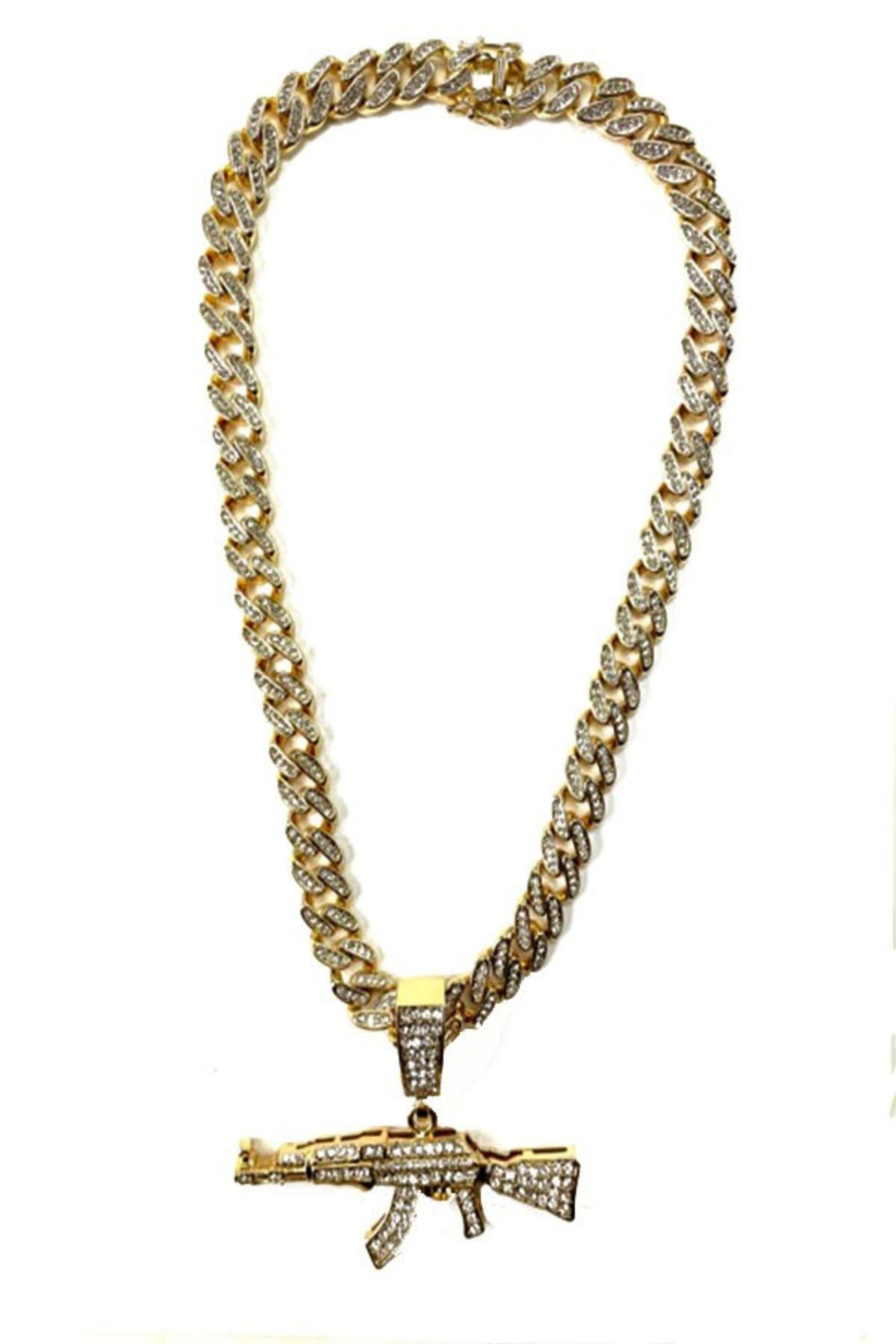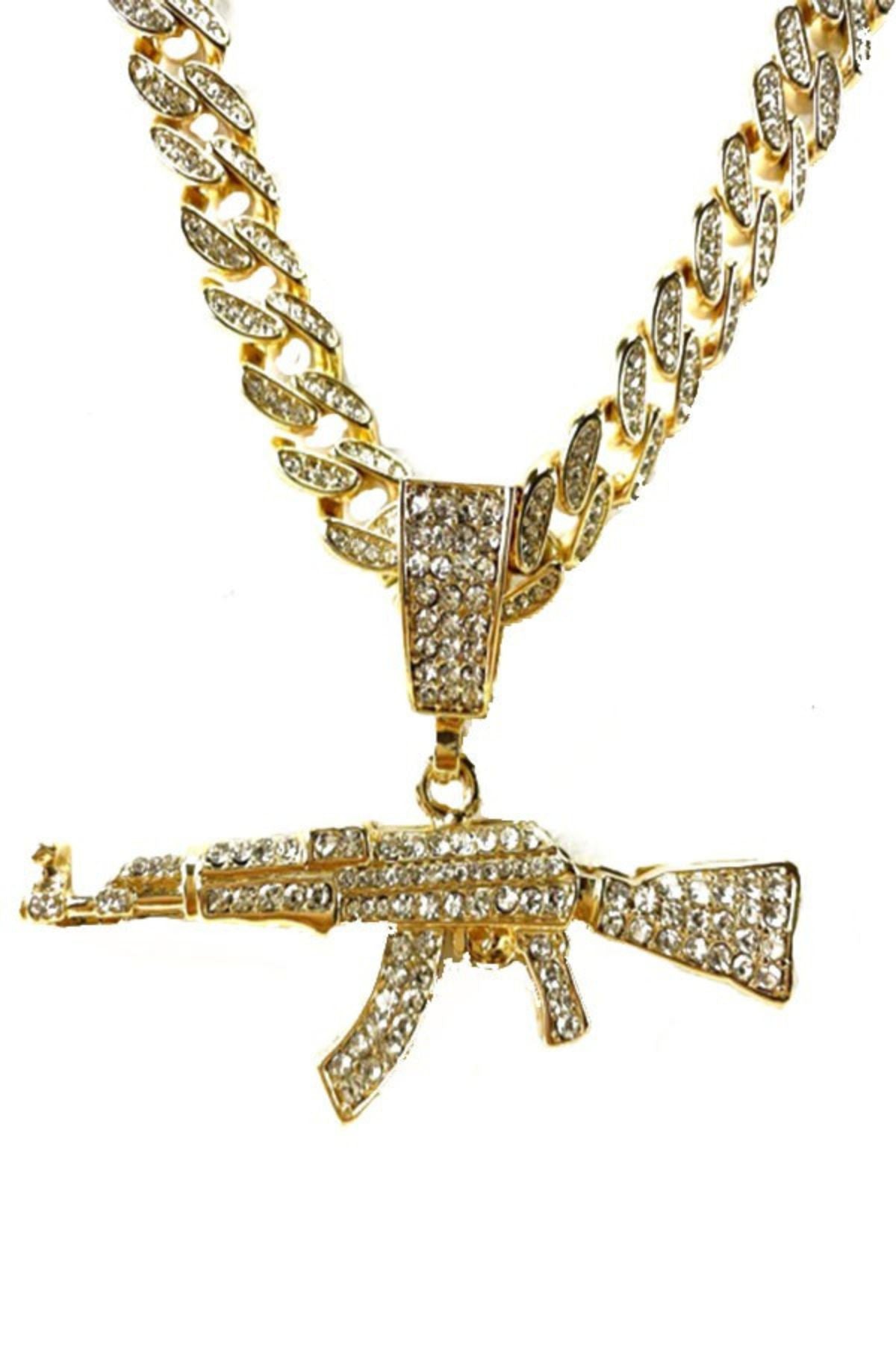 The design of this pendant necklace is inspired by hip hop culture, making it a trendy choice for fashion-forward individuals. The machine gun pendant, measuring 3 inches by 2 inches, adds an edgy touch to any outfit. Whether you're dressing up for a night out or just want to add some flair to your everyday look, this necklace is the perfect accessory.