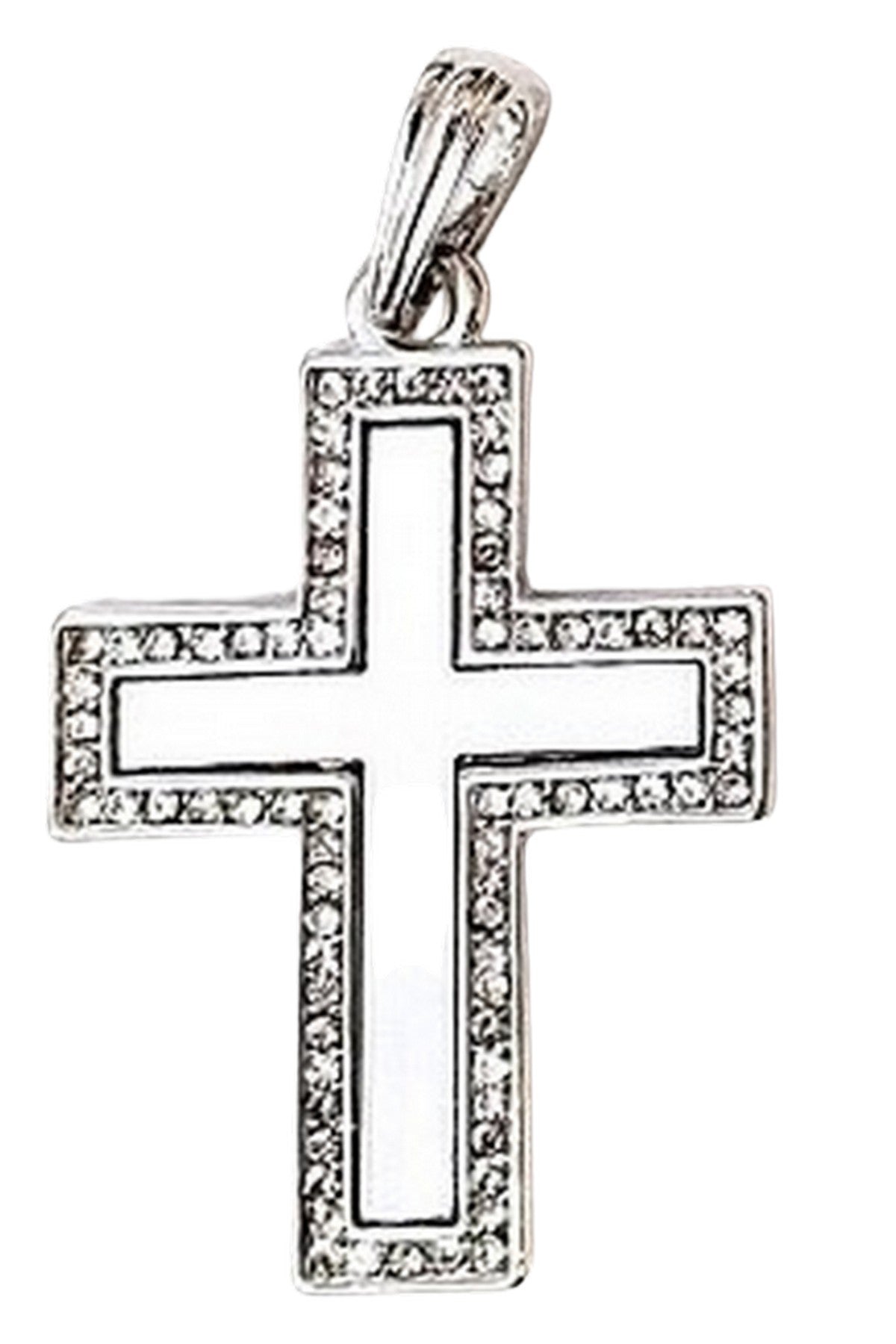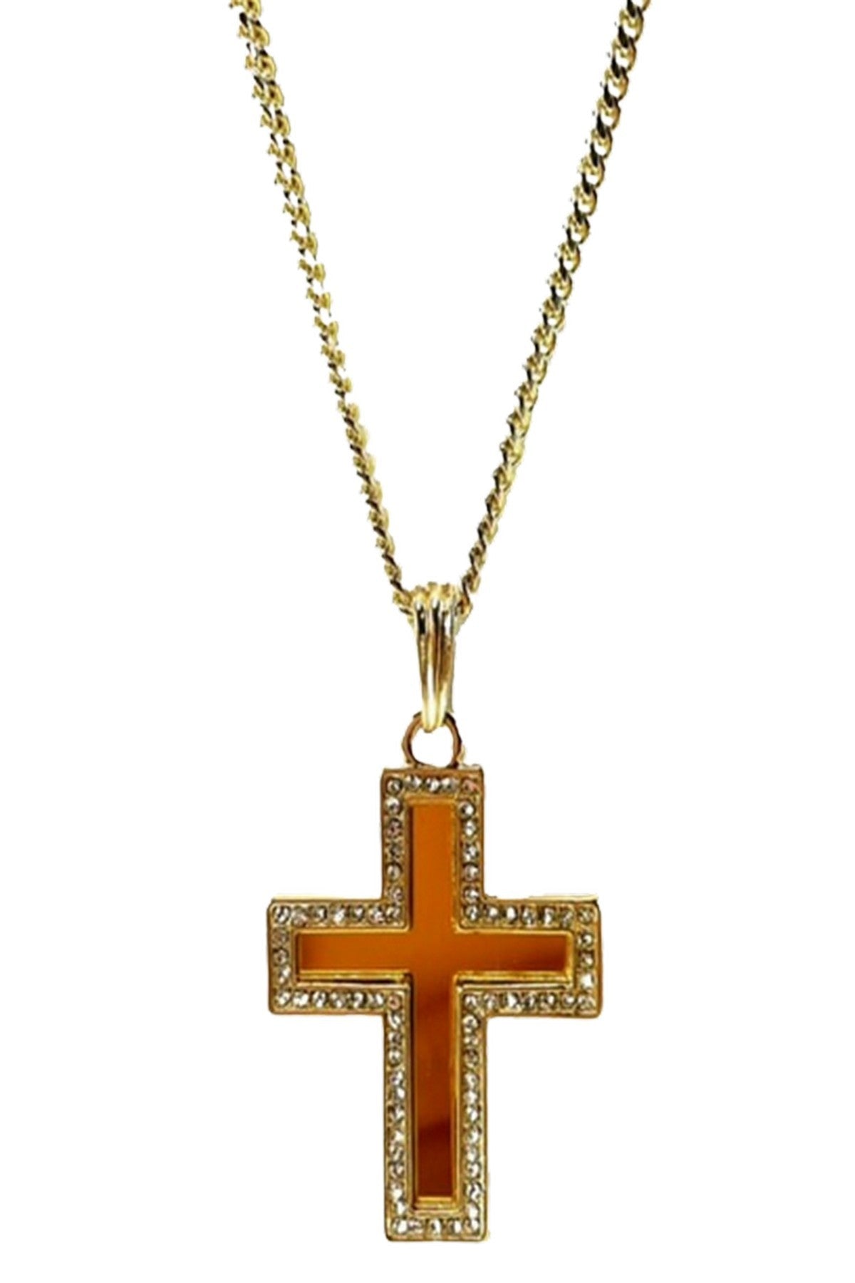 Rhinestone cross pendant necklace with sparkling details, approximately 28 inches long.