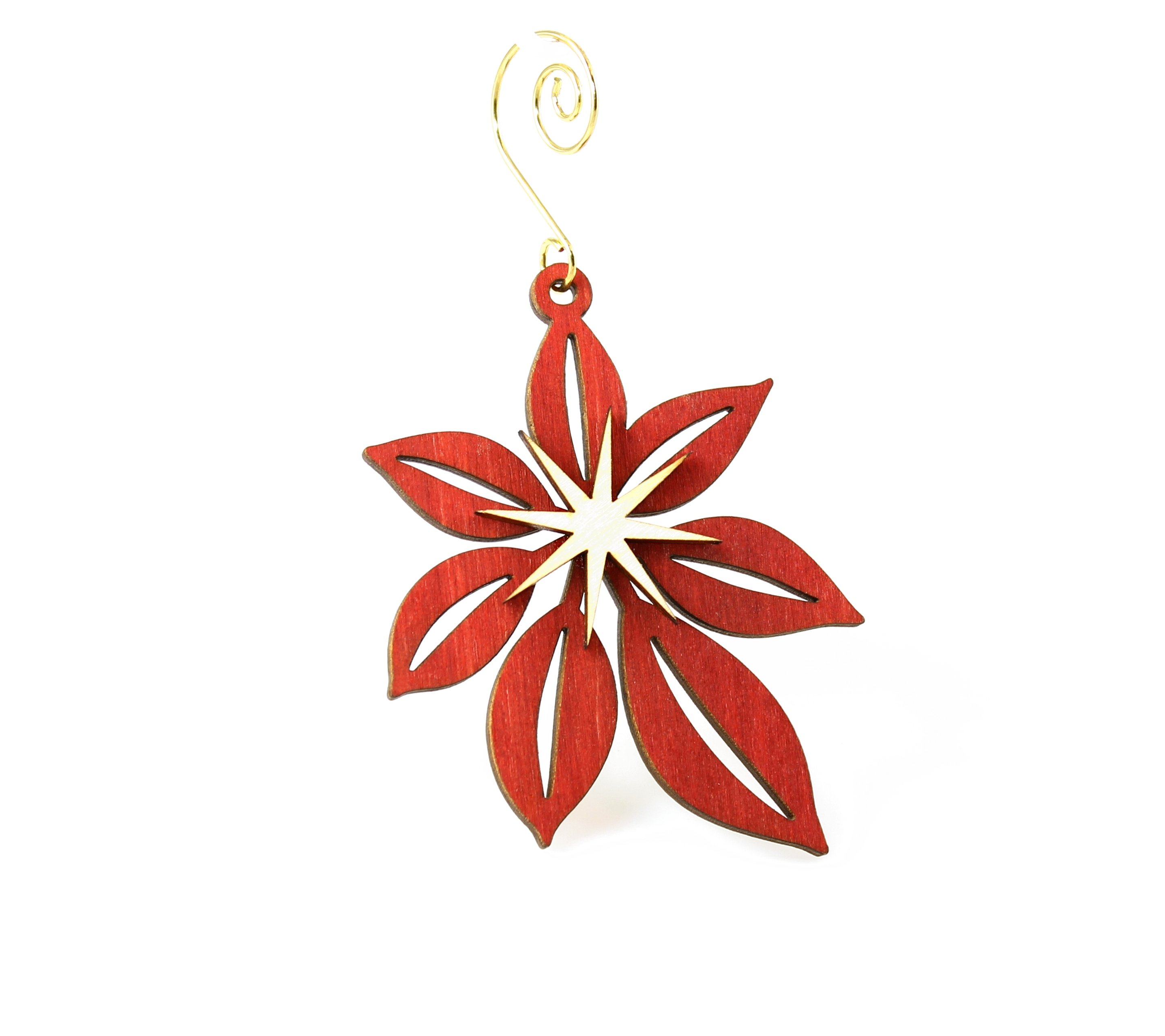 Poinsettia Ornament #9992 made from eco-friendly birch wood, featuring intricate laser-cut design and stained with water-based dye.