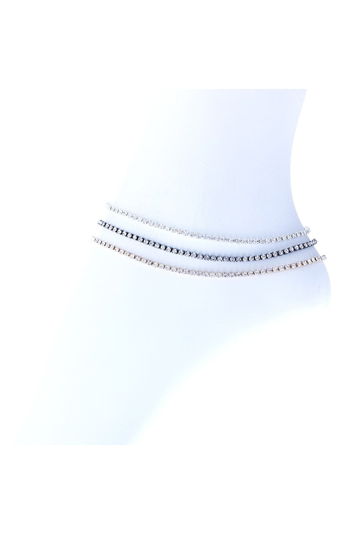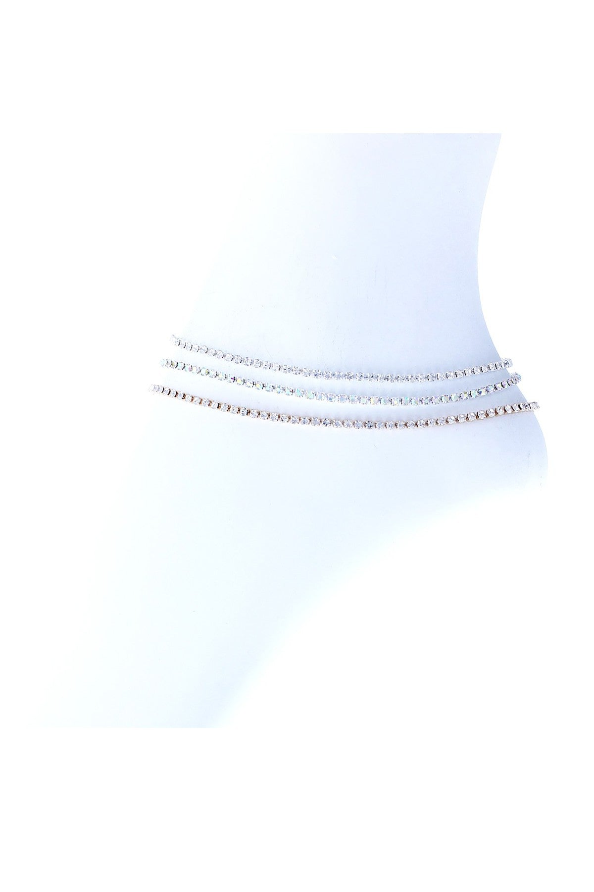 This anklet showcases a beautiful mix of colors that can complement any outfit. The rhinestones catch the light beautifully, adding a shimmering effect that is both eye-catching and sophisticated. The three strands create a layered look that adds depth and dimension to your ankle, making it a standout piece in your jewelry collection.