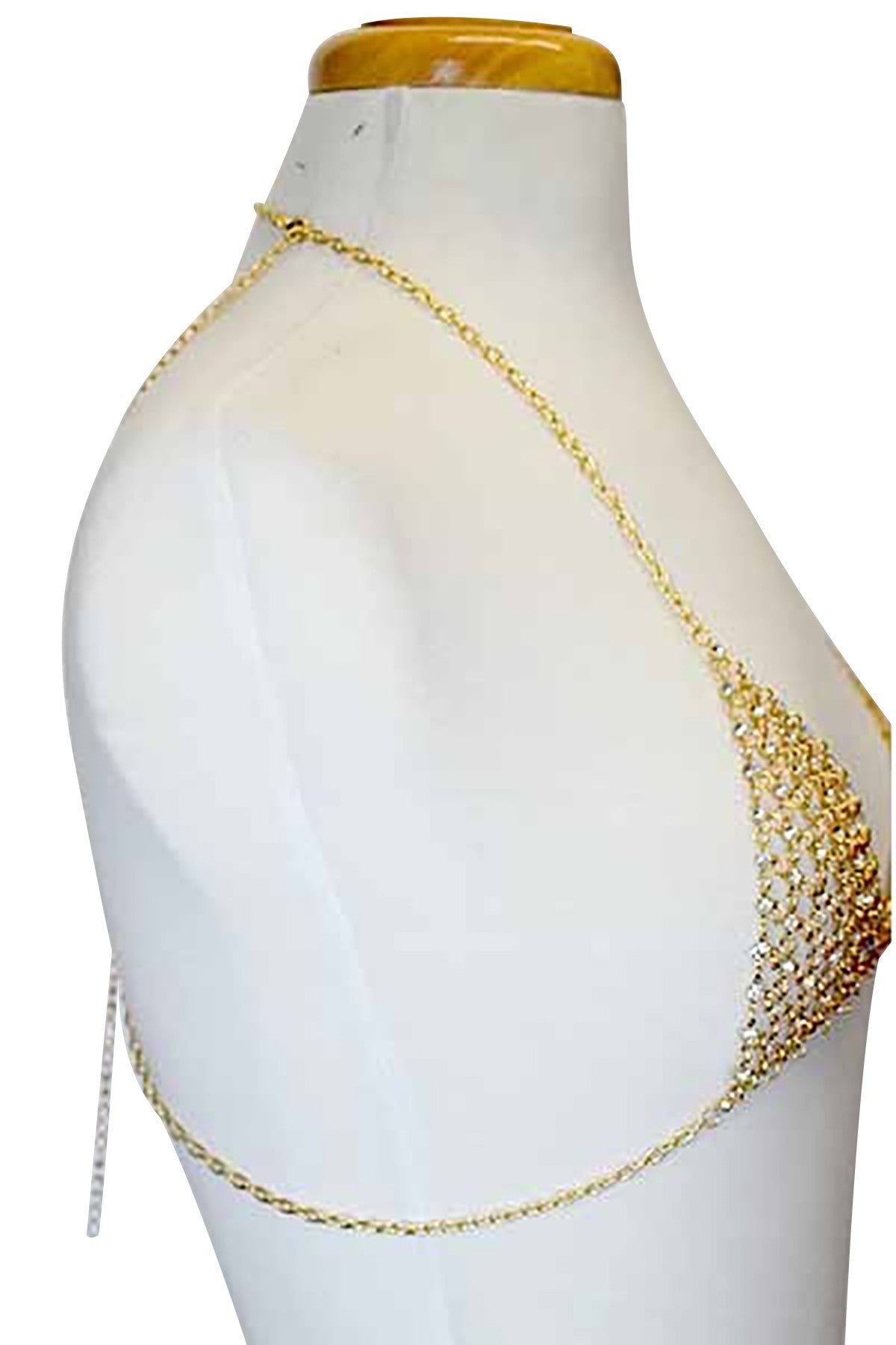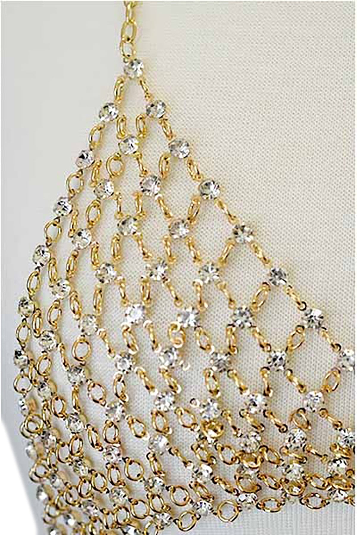The Rhinestone Beaded Chain Bralette features an approximate length of 31 inches, providing a flattering fit that complements various body types. The bralette is adorned with shimmering rhinestones that catch the light beautifully, making it an eye-catching piece for any fashion-forward individual. The adjustable lobster claw clasp ensures a secure fit, allowing you to customize the length to suit your style and comfort.
