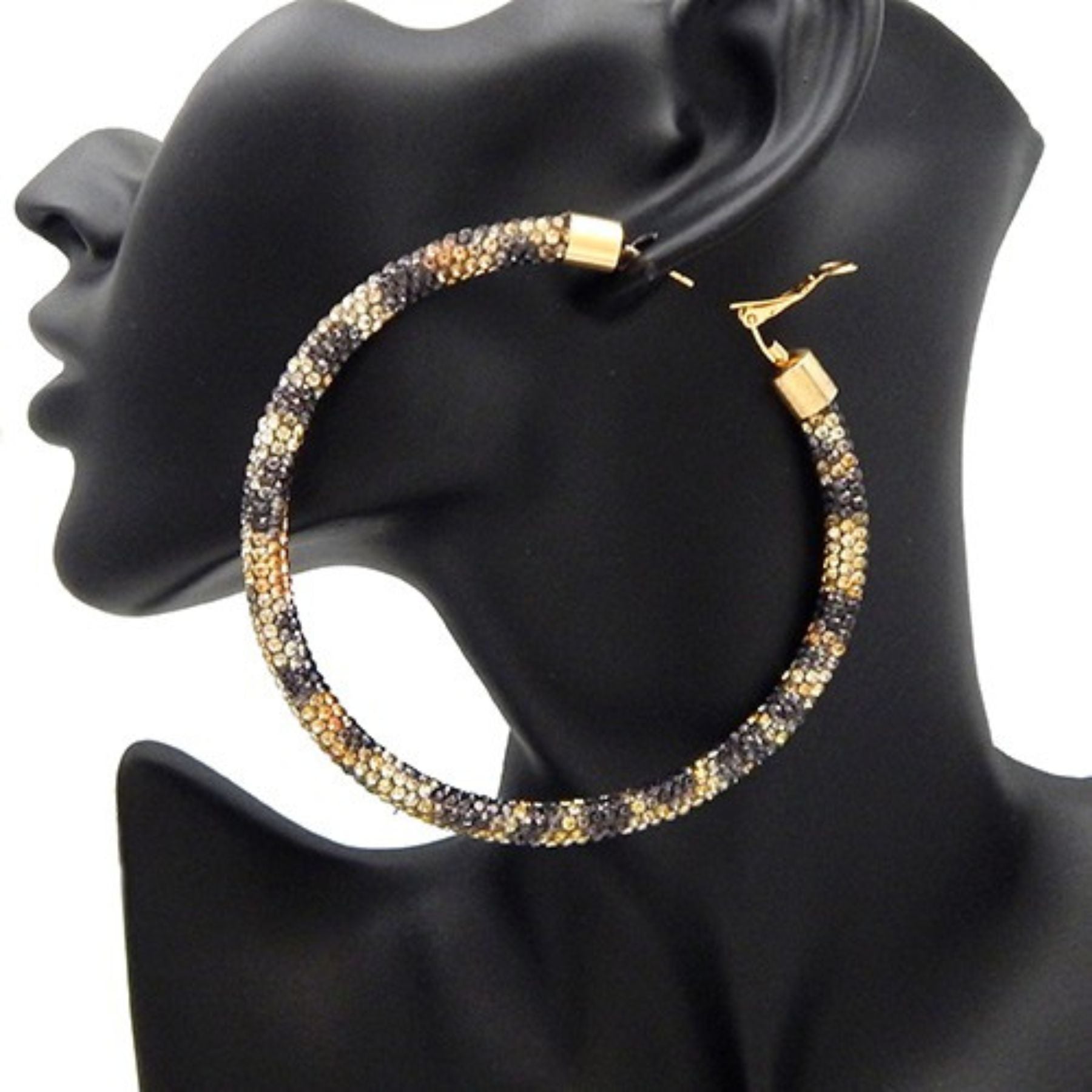 Stylish Rhinestone Leopard Hoop Earrings with sparkling accents and latch back closure.