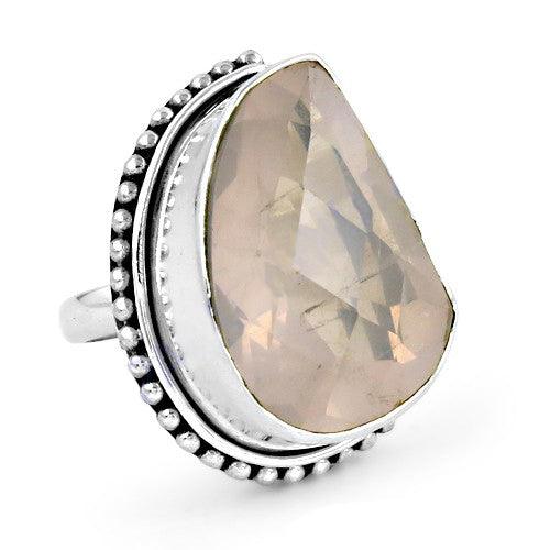 This designer ring features a unique and stylish design that makes it a versatile accessory for any occasion. Whether you're dressing up for a formal event or adding a touch of elegance to your everyday look, this ring is sure to turn heads. The soft pink hue of the rose quartz complements the shiny silver band, creating a harmonious balance that is both eye-catching and sophisticated.