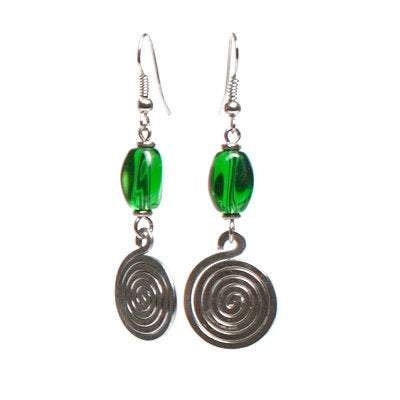The design of these earrings features a beautiful spiral coil made from reused aluminum and brass, creating a unique and eye-catching silhouette. The coil is suspended from a vibrant bead, adding a pop of color that enhances the overall aesthetic. The silver hooks provide a secure fit while adding a touch of sophistication to the earrings.