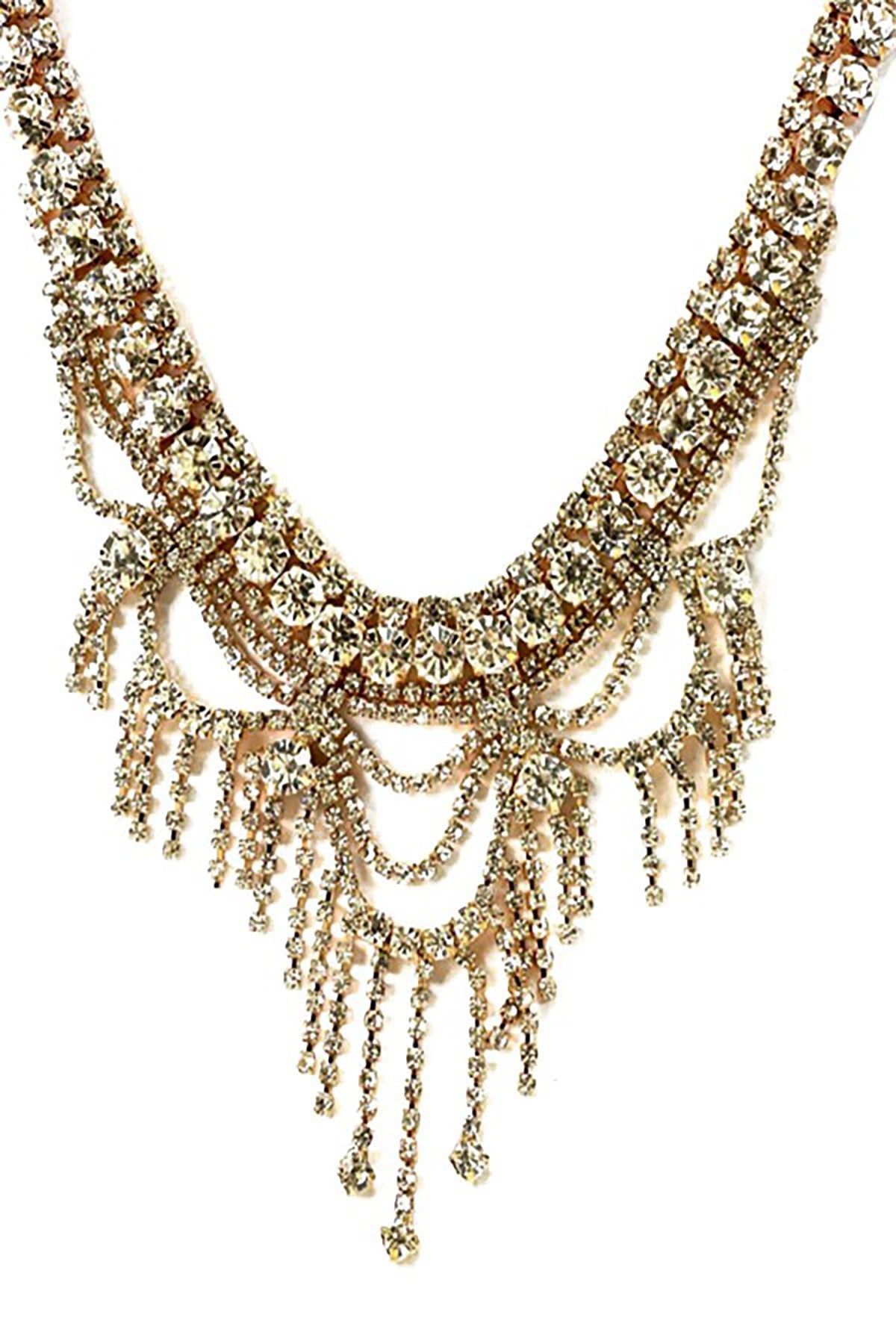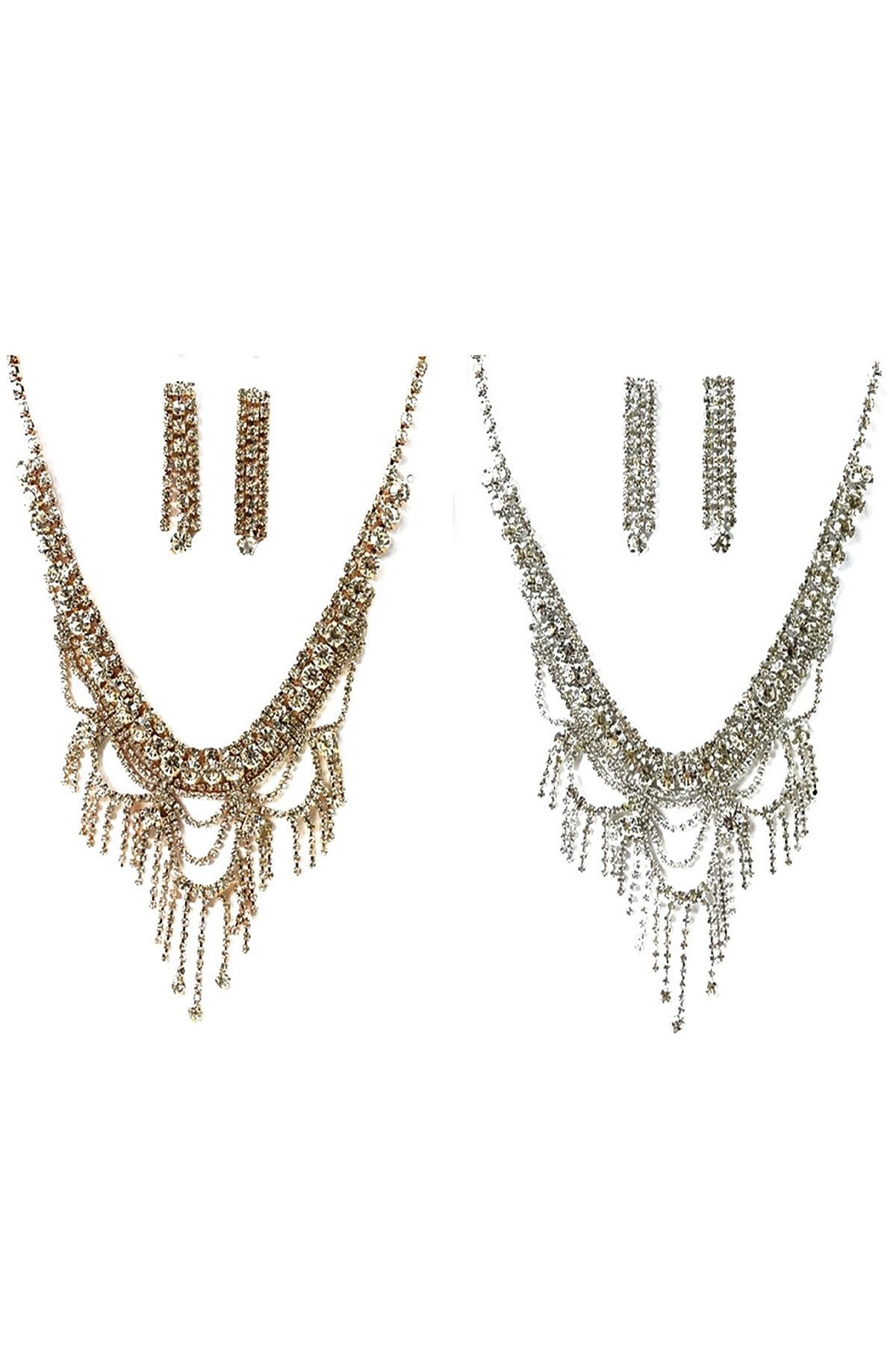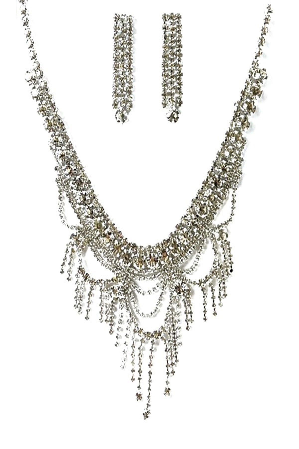 A stunning chandelier statement necklace set with rhinestone accents, featuring a lobster claw clasp and extender.