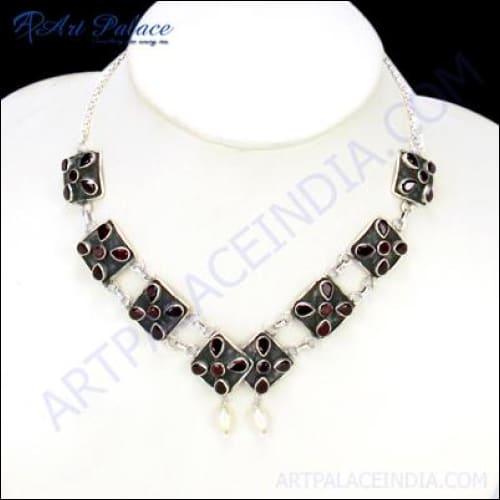 Indulge in the exquisite elegance of the Stunning Adjustable Pearl and Garnet Gemstone Silver Necklace. This remarkable accessory combines the timeless allure of pearls with the captivating beauty of garnet gemstones, creating a piece that radiates sophistication and refinement. The necklace is designed to be both fashionable and functional, making it a must-have addition to any jewelry collection.