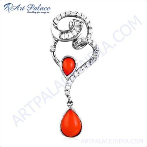 Unique Feminine Coral CZ Gemstone Silver Pendant showcasing vibrant coral color and elegant silver design.