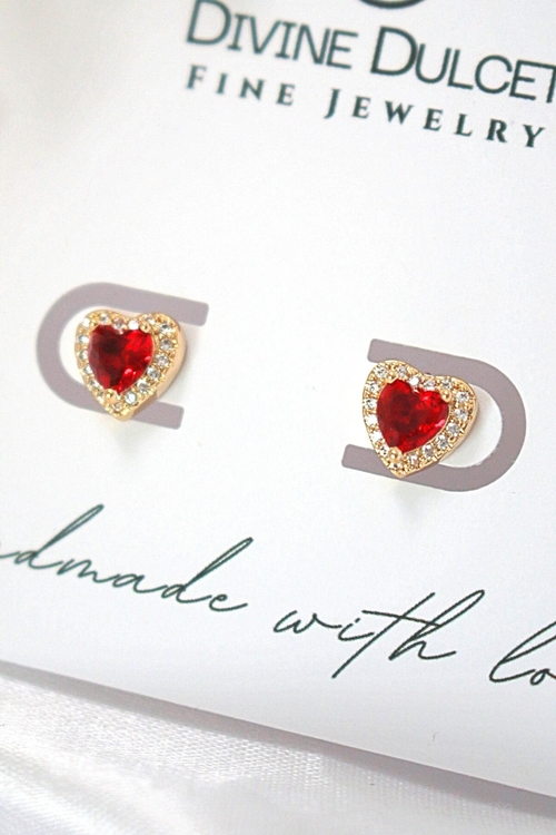 Cute and Dainty heart shaped stud earrings inlaid with red and colorless cubic zirconia.