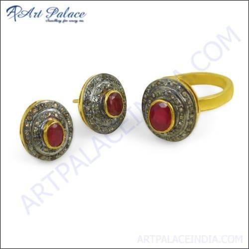 Dropship Victorian Designer Diamond Ruby Gold Plated Silver Earrings & Ring Set