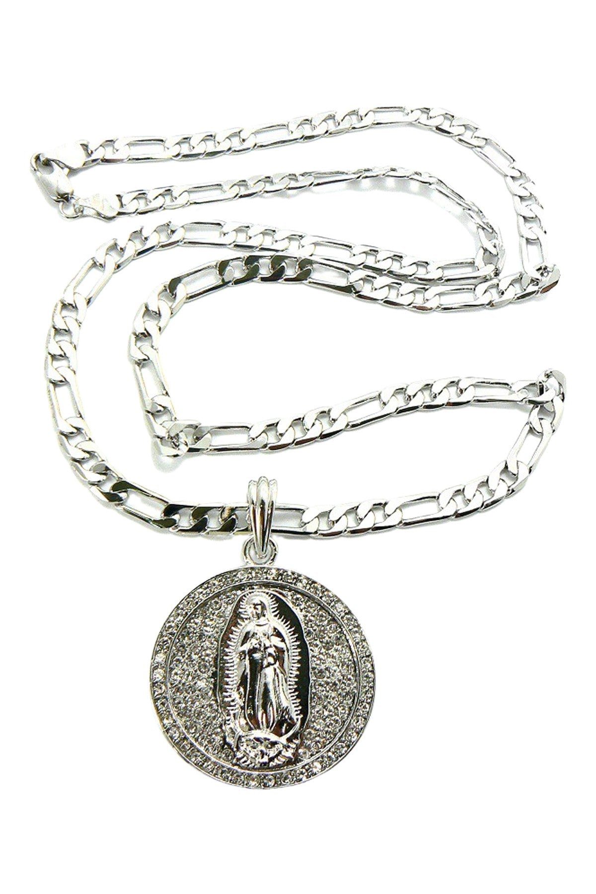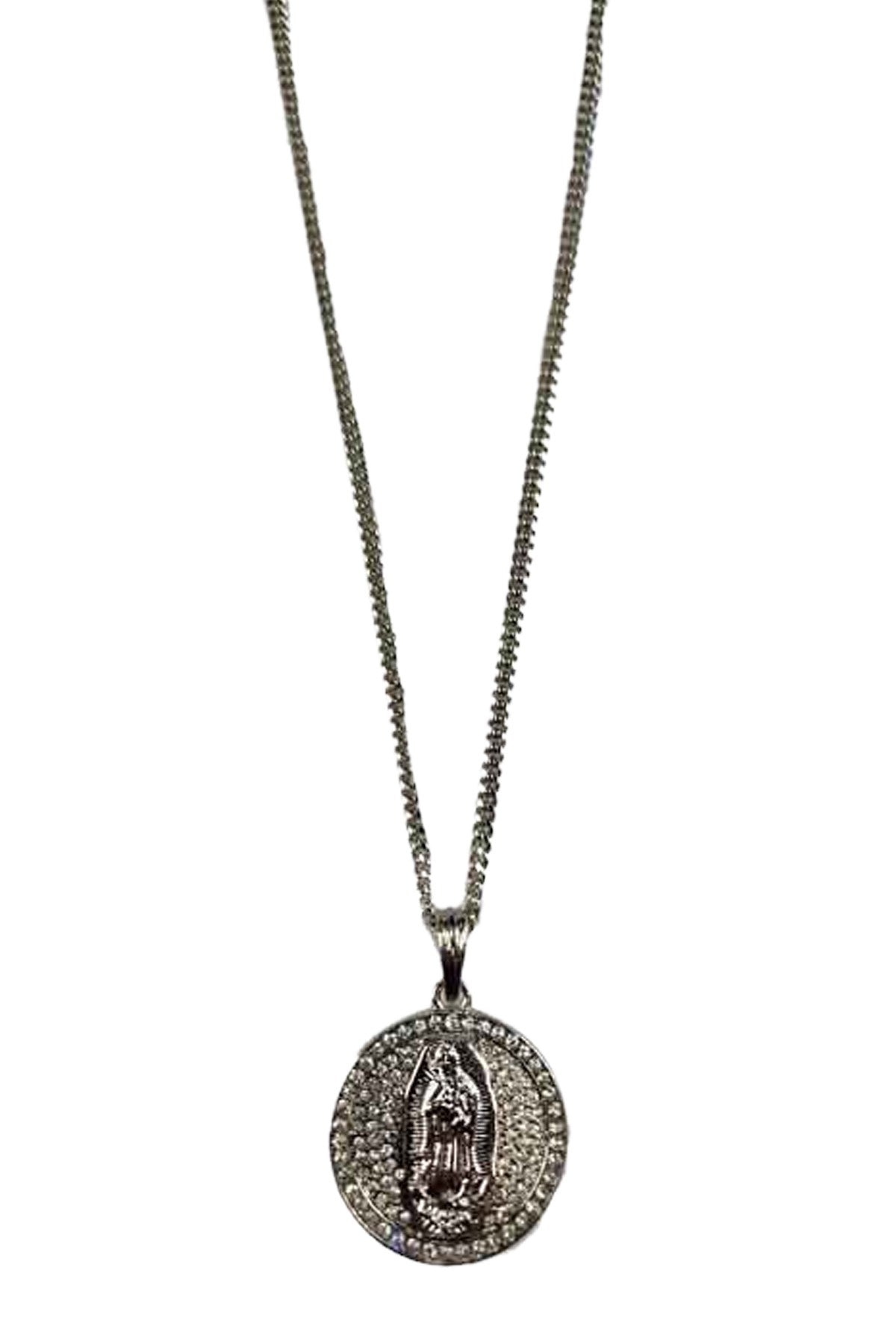 A crystal Virgen of Guadalupe medal pendant necklace with a 30-inch chain, featuring a 1.5-inch diameter pendant and a lobster claw clasp.