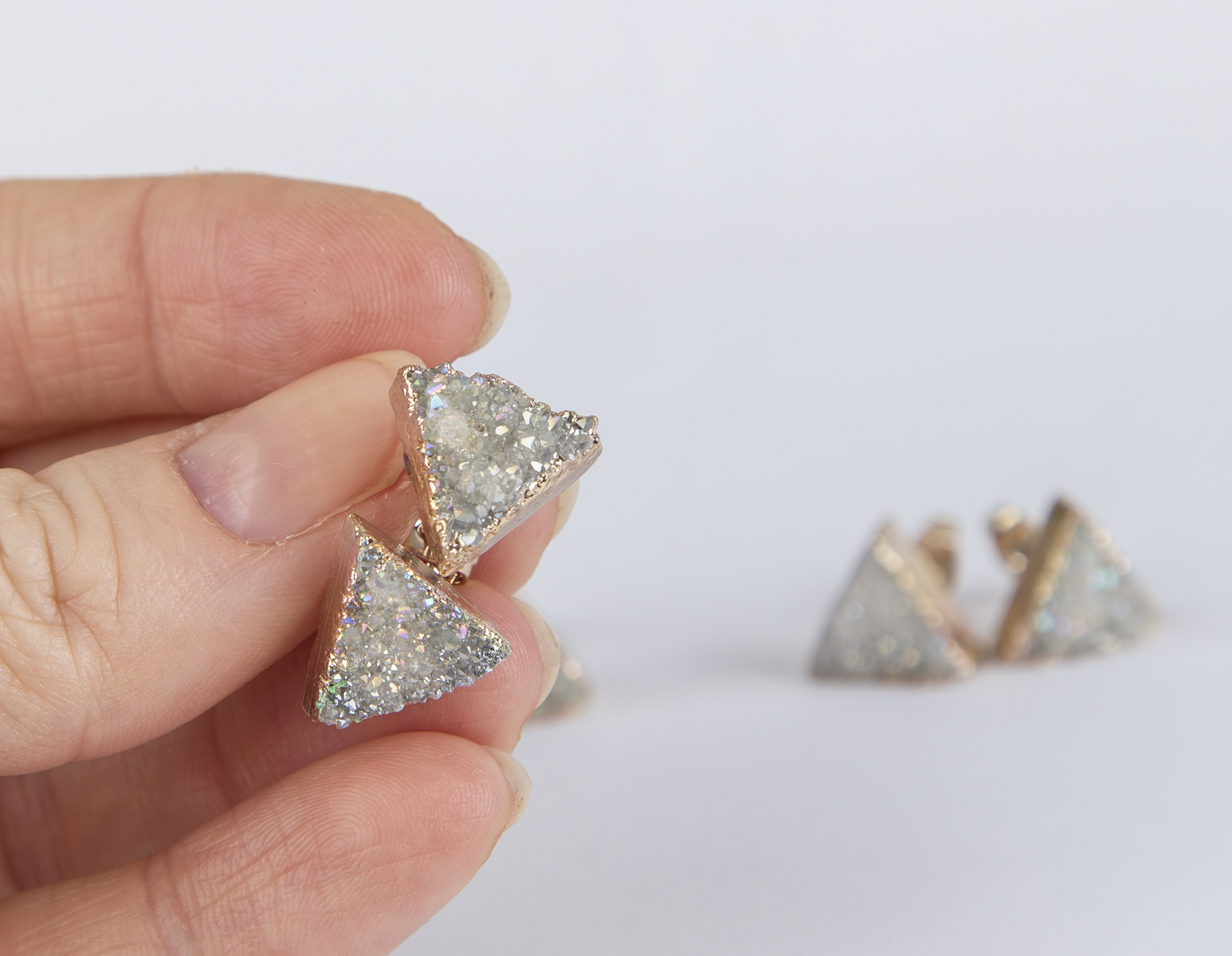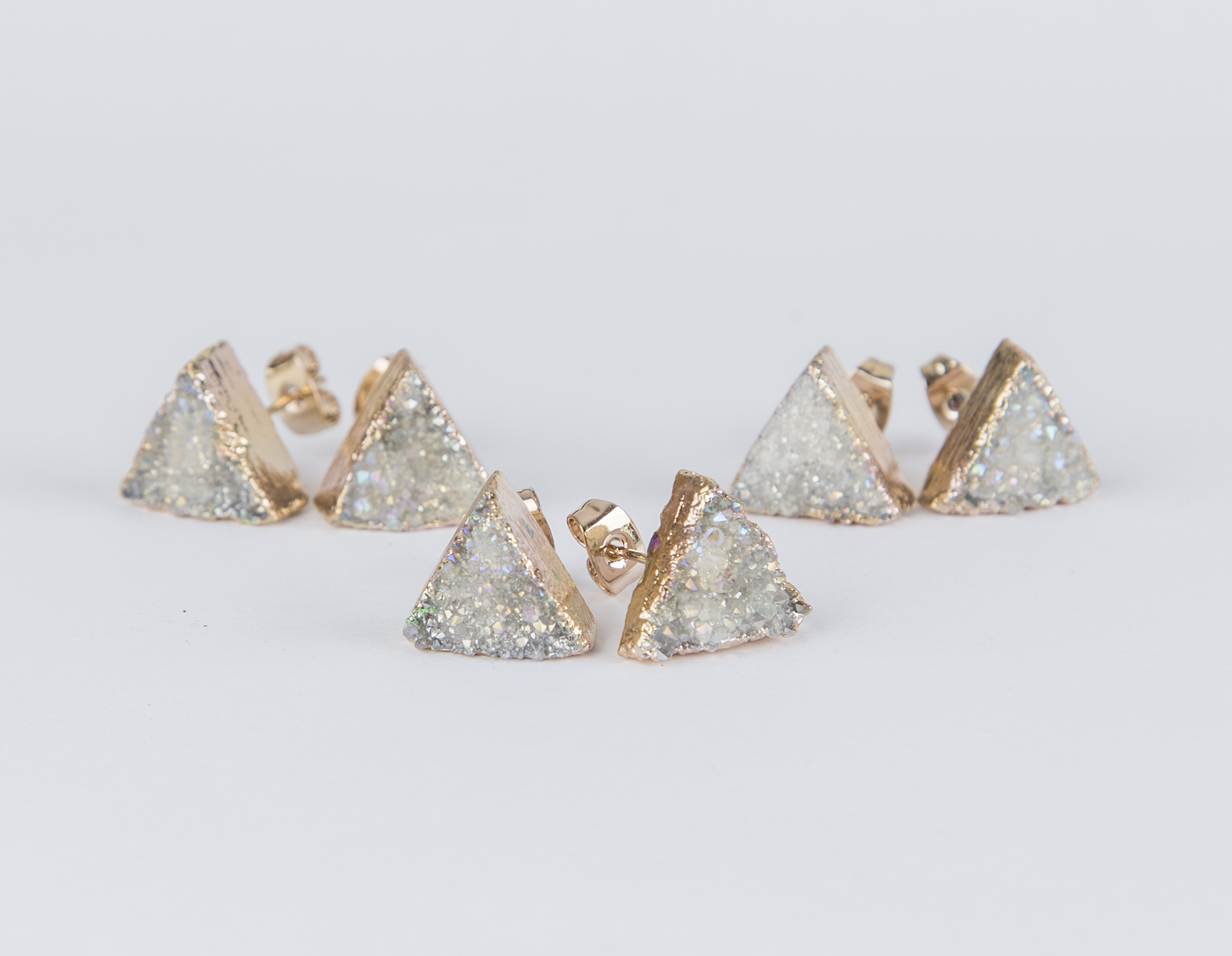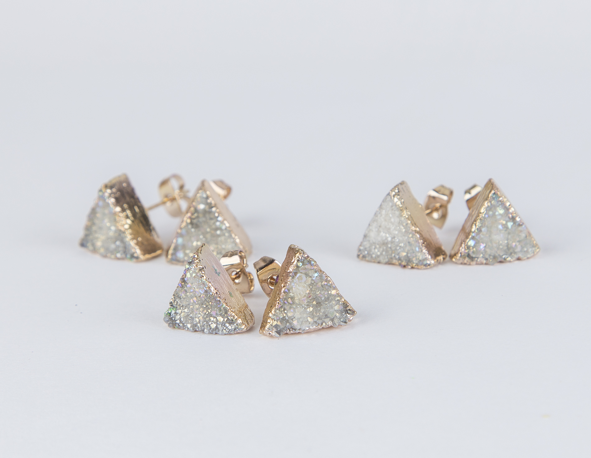 Elegant white triangle druzy earrings with gold plated studs, showcasing their sparkling natural stone design.