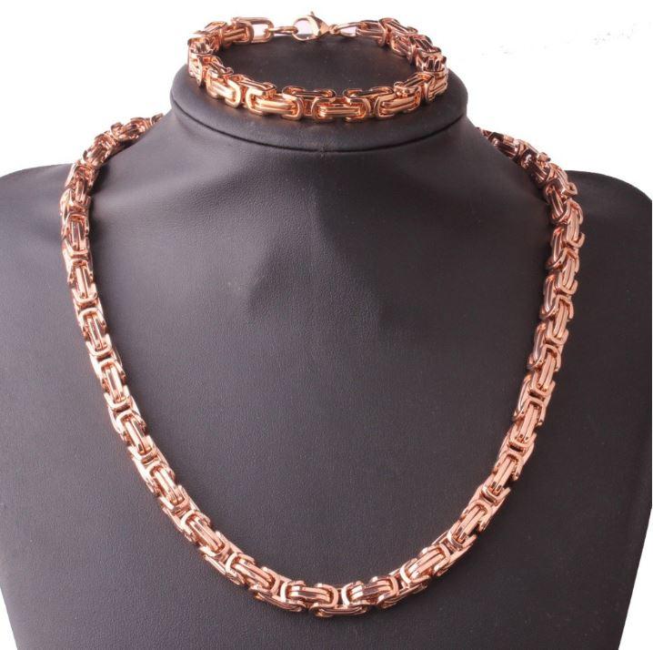 8 MM Rose Plated 24" Solid Byzantine Link Chain with matching bracelet, showcasing intricate link design and luxurious rose gold finish.