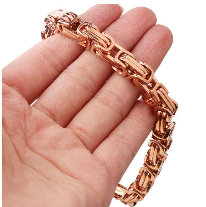 This chain is not just a piece of jewelry; it is a statement of style and sophistication. It makes an excellent gift for birthdays, anniversaries, or any special occasion. Whether you're treating yourself or surprising a loved one, the 8 MM Rose Plated 24" Solid Byzantine Link Chain is sure to impress. Its timeless design and versatile nature make it a must-have addition to any jewelry collection.