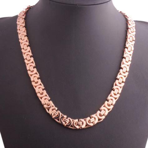 A 9 MM 24-inch rose gold plated flat Byzantine chain with a matching 8.75-inch bracelet, showcasing its elegant design and durable stainless steel material.