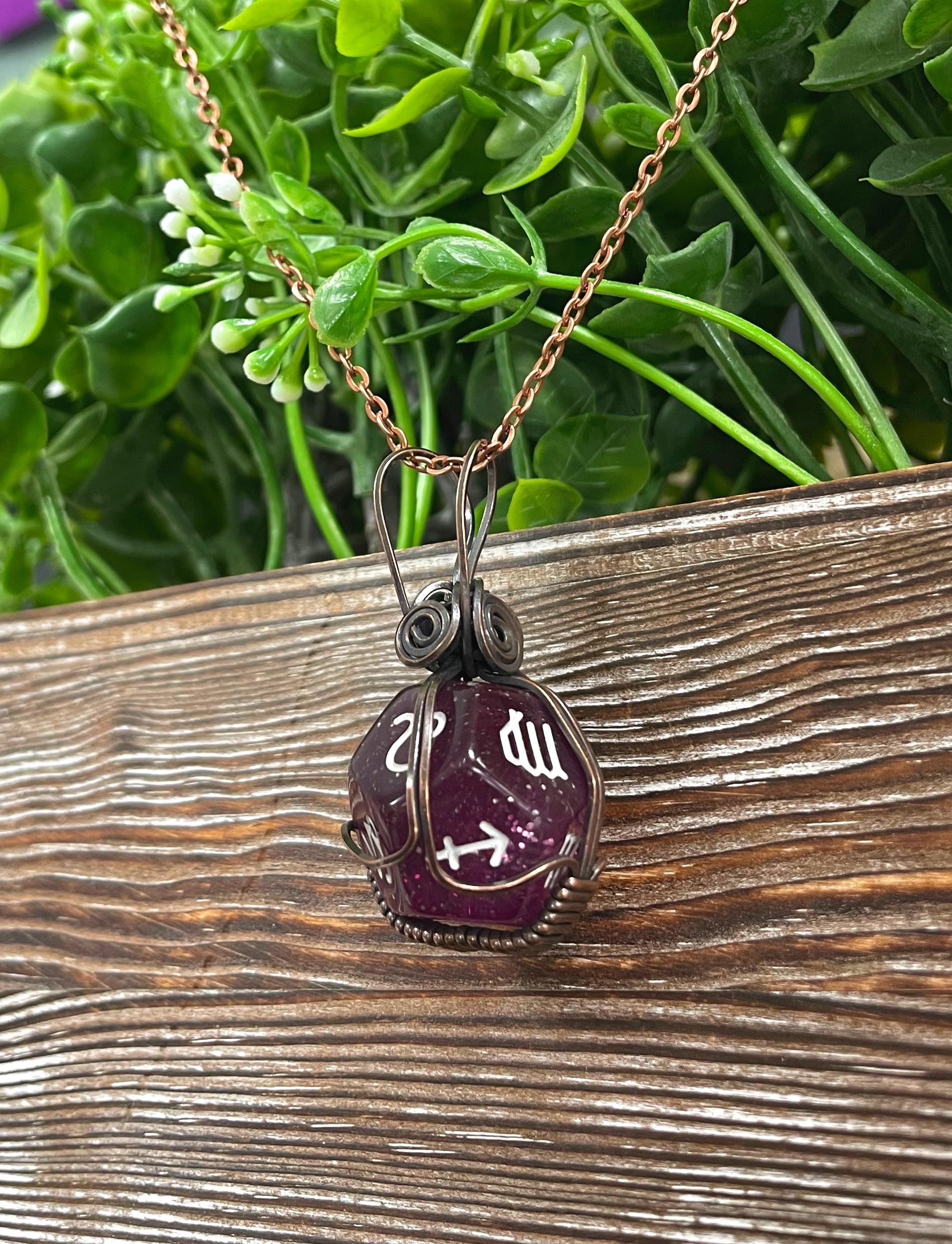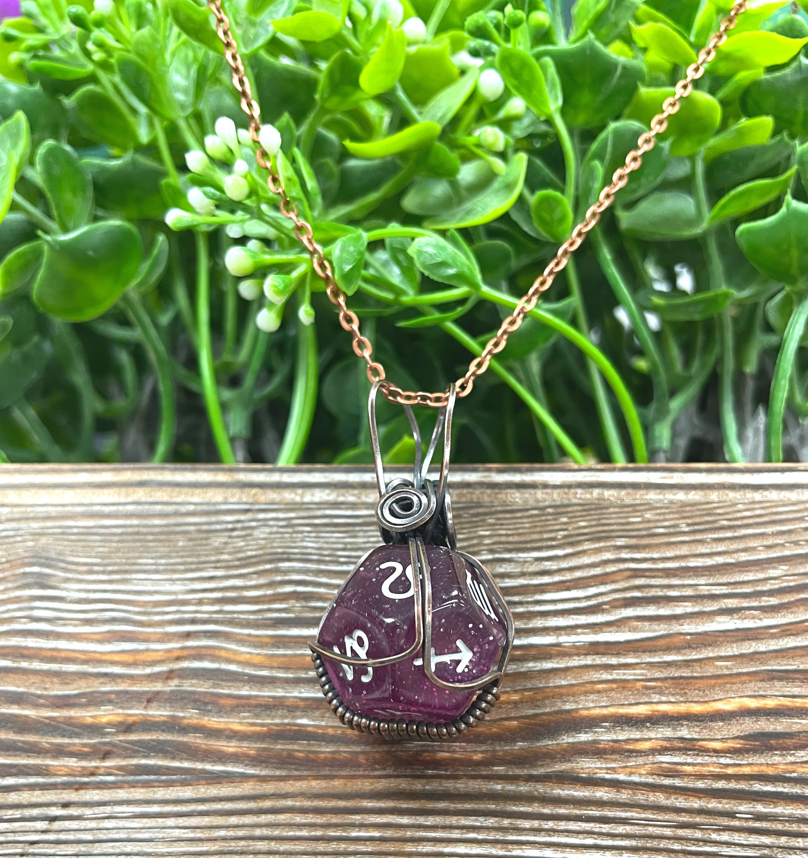 This pendant is crafted with care, using high-quality materials to ensure durability and style. The D12 dice is left unsealed, allowing it to develop an antique look over time. The oxidized copper wire wrapping enhances the overall aesthetic, giving it a rustic yet polished finish. Each piece is unique, as the dice may come in various colors while maintaining the same symbols, making it a one-of-a-kind accessory.