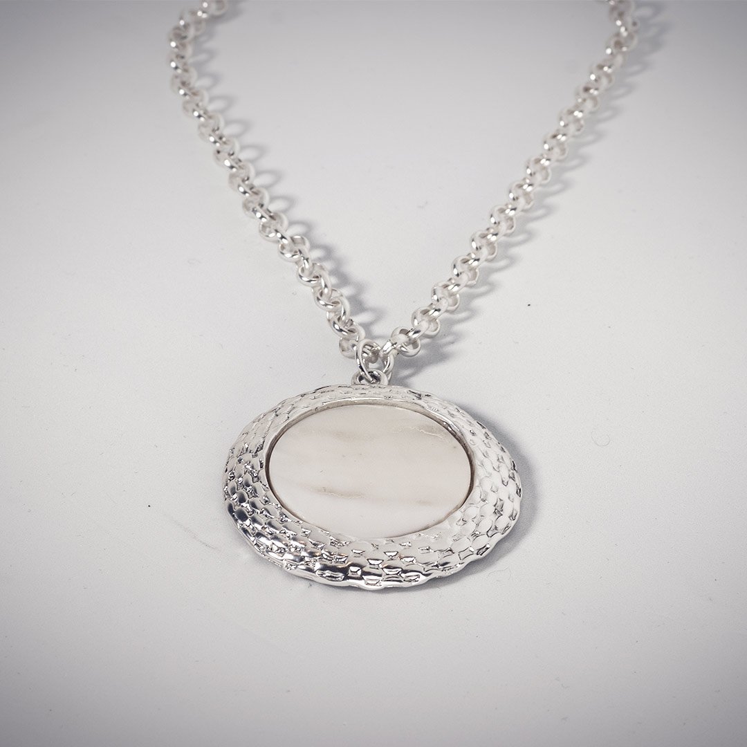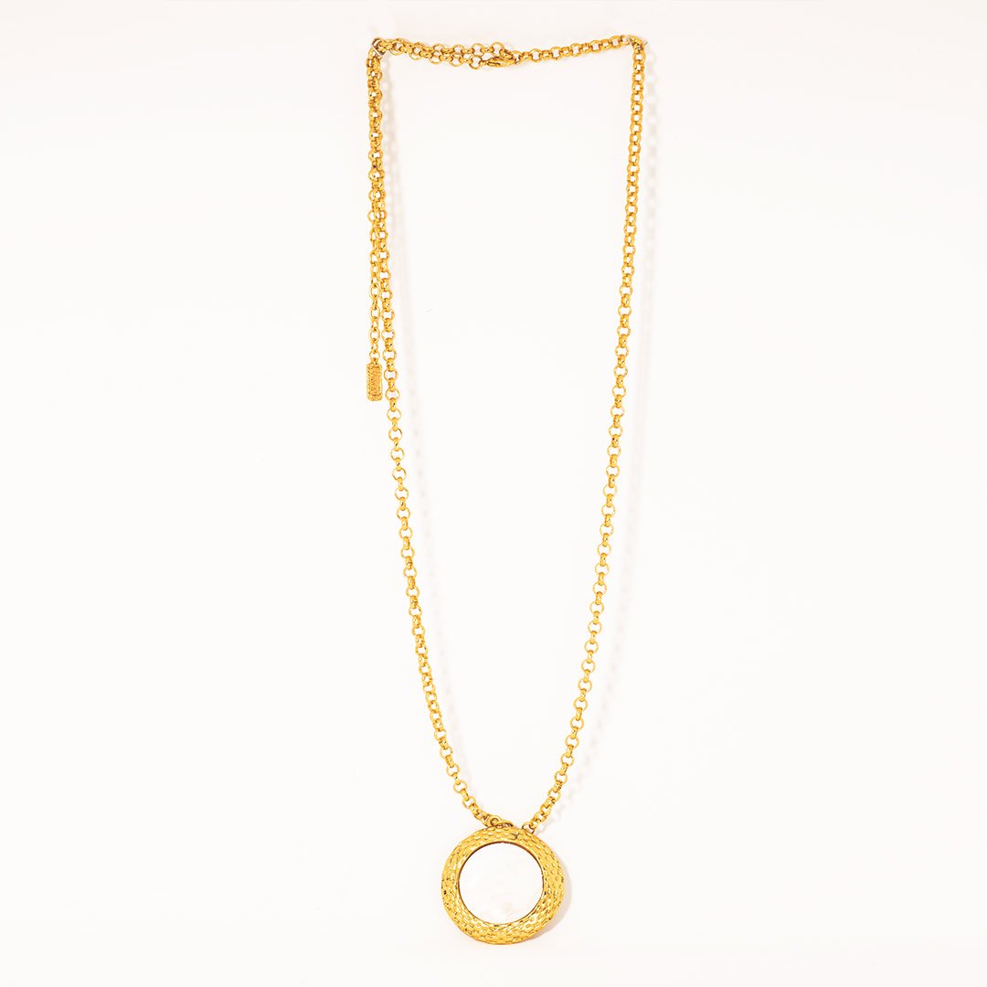 The Bethany Pendant Necklace is a stunning piece of jewelry that combines elegance and versatility, making it a perfect addition to any jewelry collection. At the heart of this exquisite necklace is a shimmering white mother of pearl disc cabochon, which captures and reflects light beautifully, adding a touch of sophistication to your outfit. The mother of pearl is known for its iridescent qualities, which means it can change color slightly depending on the angle of light, making it a unique and eye-catching centerpiece. Surrounding the mother of pearl is a textured rich frame that enhances its beauty and adds depth to the design. This intricate framing not only highlights the pendant but also adds a luxurious feel to the overall piece. The pendant is elegantly suspended from a belcher chain, which is known for its durability and classic look. The chain features a jump ring bail that allows the pendant to hang gracefully, ensuring that it sits perfectly along your neckline. One of the standout features of the Bethany Pendant Necklace is its versatility. You can wear it alone for a simple yet elegant look, or you can mix and match it with other necklaces for a trendy layered effect. The necklace is designed to be adjustable, thanks to its lobster clasp claw and cable link chain extender, which allows you to customize the length to suit your style and outfit. Whether you're dressing up for a special occasion or looking for a chic accessory for everyday wear, this necklace is a fantastic choice. The Bethany Pendant Necklace is crafted from high-quality materials, ensuring that it not only looks beautiful but is also durable. The metal components are made from pewter that is plated with 24 kt gold, sterling silver, or rose gold, giving you options to match your personal style. This thoughtful design ensures that the necklace will maintain its shine and luster over time, making it a worthwhile investment for your jewelry collection. The measurements of the necklace are also noteworthy; it is 36 inches long, with a pendant that has a diameter of 2 inches and an additional 2-inch extender. This length is ideal for layering with other necklaces or wearing it as a standalone piece that draws attention to your neckline. The lobster clasp closure is not only secure but also easy to use, allowing you to put on and take off the necklace with ease. The Bethany Pendant Necklace is perfect for gifting as well. Whether it's for a birthday, anniversary, or just because, this necklace is sure to delight anyone who receives it. Its timeless design and elegant materials make it a thoughtful gift that can be cherished for years to come. Additionally, the necklace is suitable for various occasions, from casual outings to formal events, making it a versatile piece that can be worn in multiple settings. In summary, the Bethany Pendant Necklace is a beautiful and versatile piece of jewelry that features a stunning mother of pearl centerpiece surrounded by a textured frame. Its adjustable length, high-quality materials, and elegant design make it a must-have accessory for anyone looking to enhance their jewelry collection. Whether worn alone or layered with other pieces, this necklace is sure to make a statement and elevate any outfit.