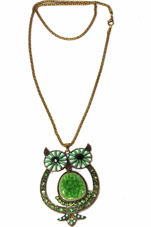The owl pendant is adorned with sparkling crystal accents that add a touch of glamour to the piece. The grand stone in the center of the pendant draws attention, while the twinkling crystals below provide additional flair. This combination of elements creates a stunning visual effect that is sure to impress. The shiny eyes of the owl are particularly captivating, making this necklace a conversation starter.