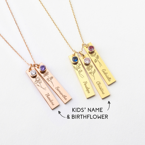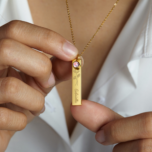 Engraved with a name and birth flower on the gold bar necklace is a great personalized name necklace for best friends. Choose to have 2-3 necklaces for your matching sister's custom birth flower necklace set.