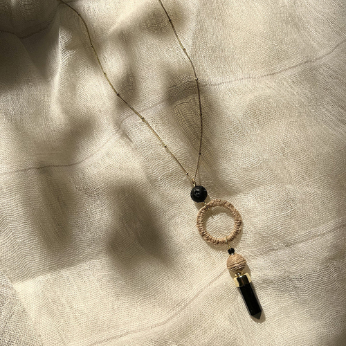 The Black Agate Jute Necklace is a stunning piece that combines natural beauty with artisanal craftsmanship. This necklace features a highly polished black agate gemstone, known for its protective and purifying properties, elegantly suspended from a unique jute halo. The combination of materials not only creates a visually appealing accessory but also adds a touch of earthy elegance to any outfit.