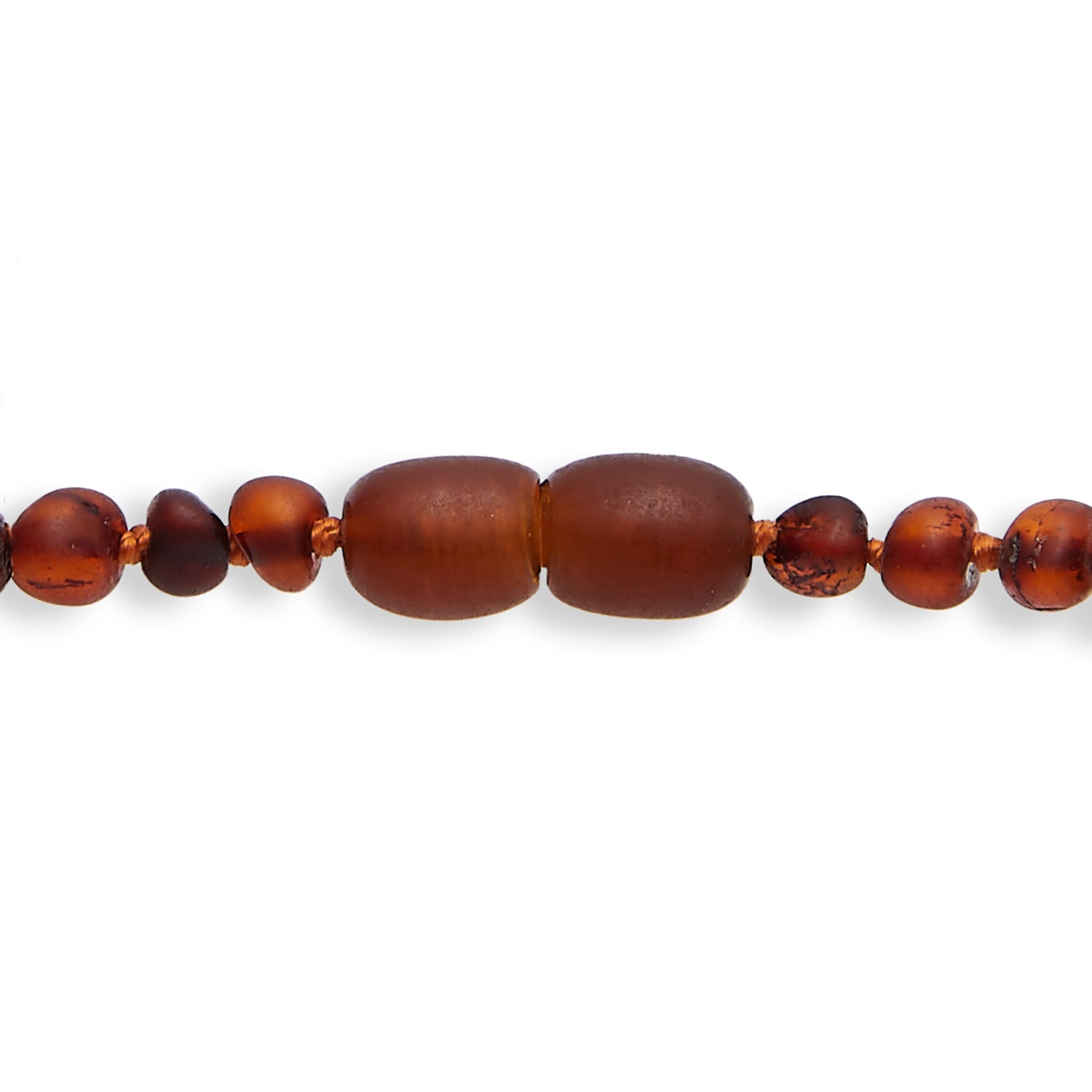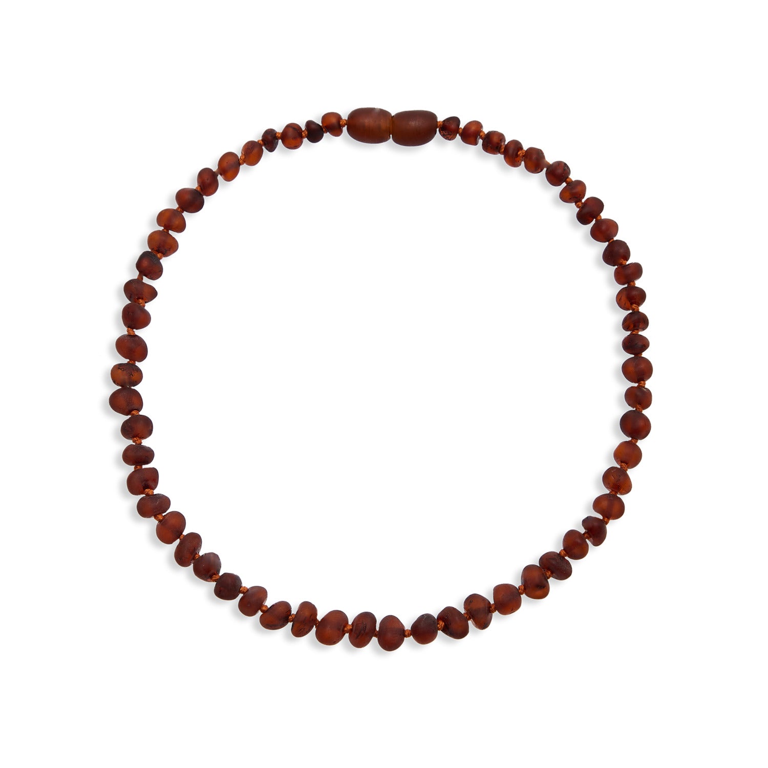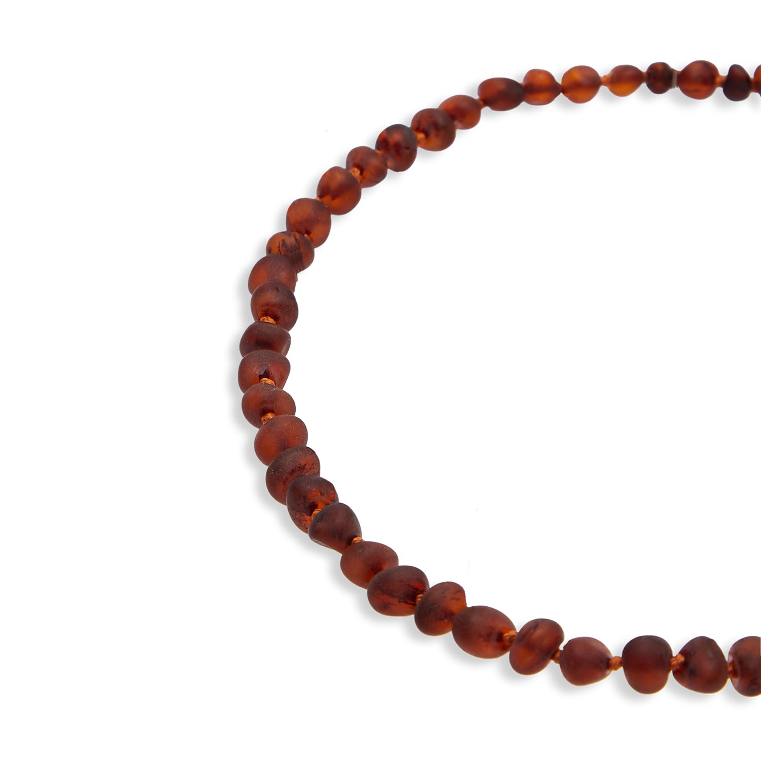 Collier en ambre couleur cognac pour bébé, conçu pour soulager les douleurs de dentition avec un fermoir sécurisé.