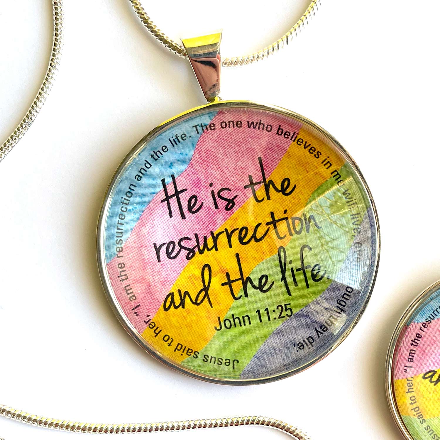 Embrace your faith and celebrate the resurrection of Jesus with our Easter Scripture Silver-Plated Colorful Christian Pendant Necklace. Order yours today and wear your beliefs proudly!