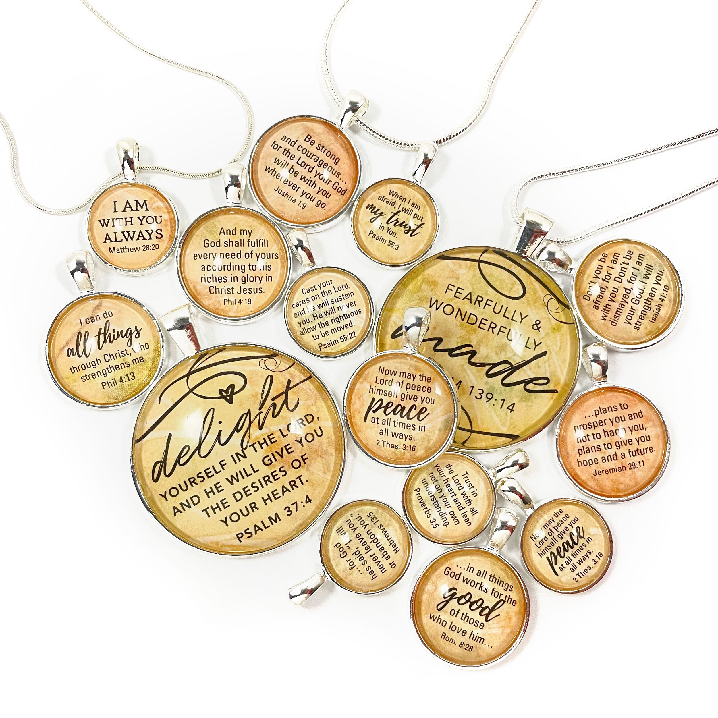 The Encouraging Scriptures Pendant Necklace features a selection of uplifting Bible verses, including: