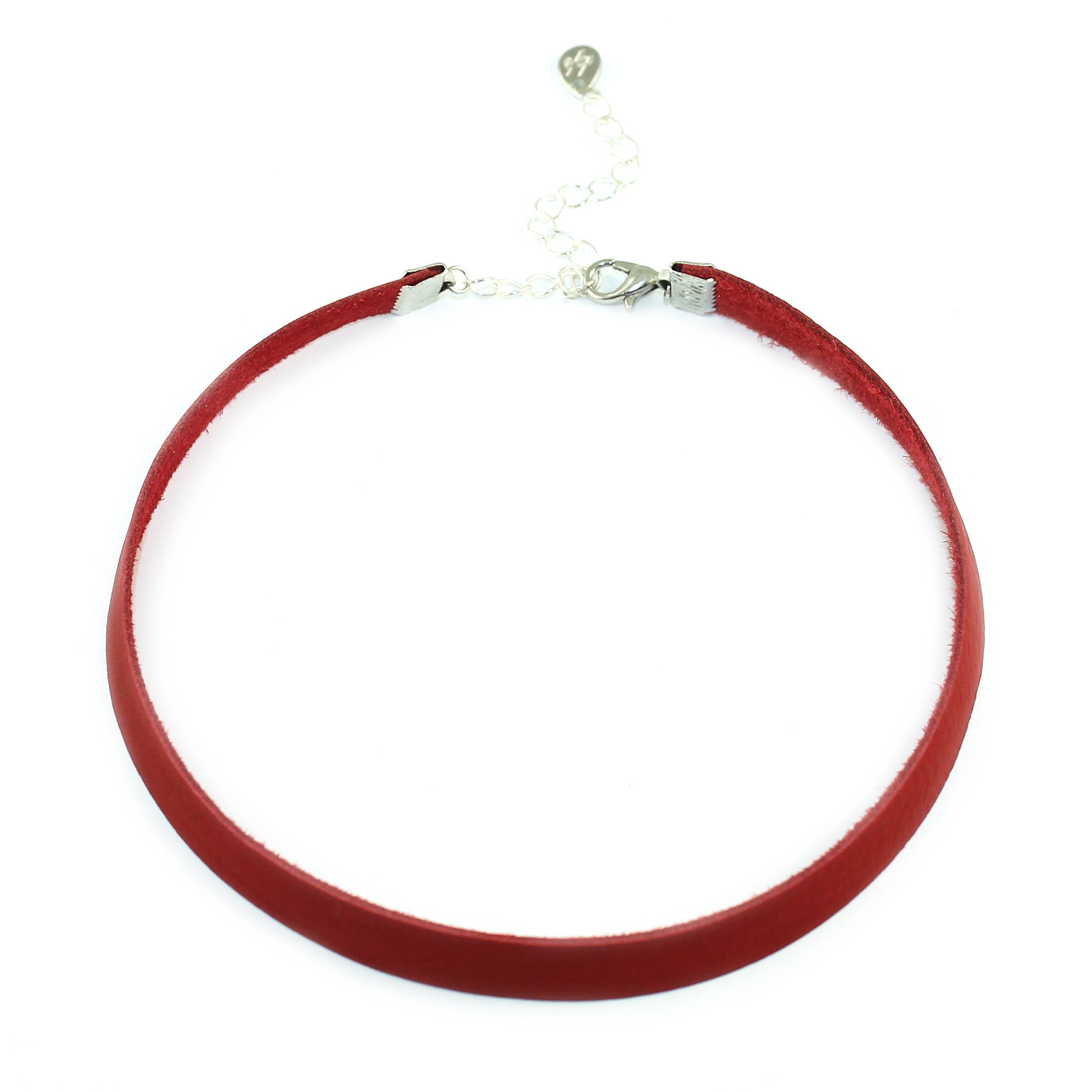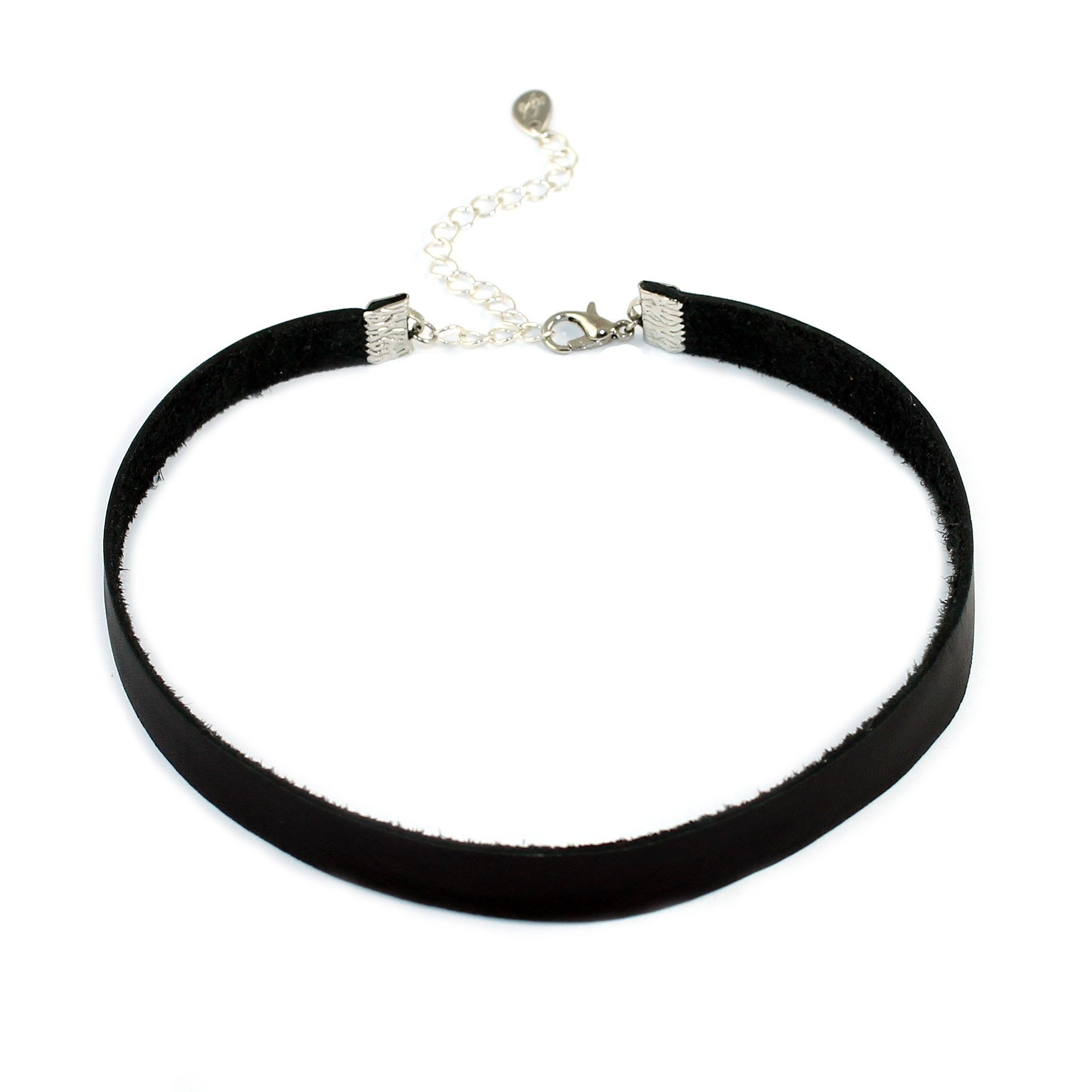 A stylish genuine leather choker necklace in three classic colors, featuring a lobster clasp and adjustable extender chain.