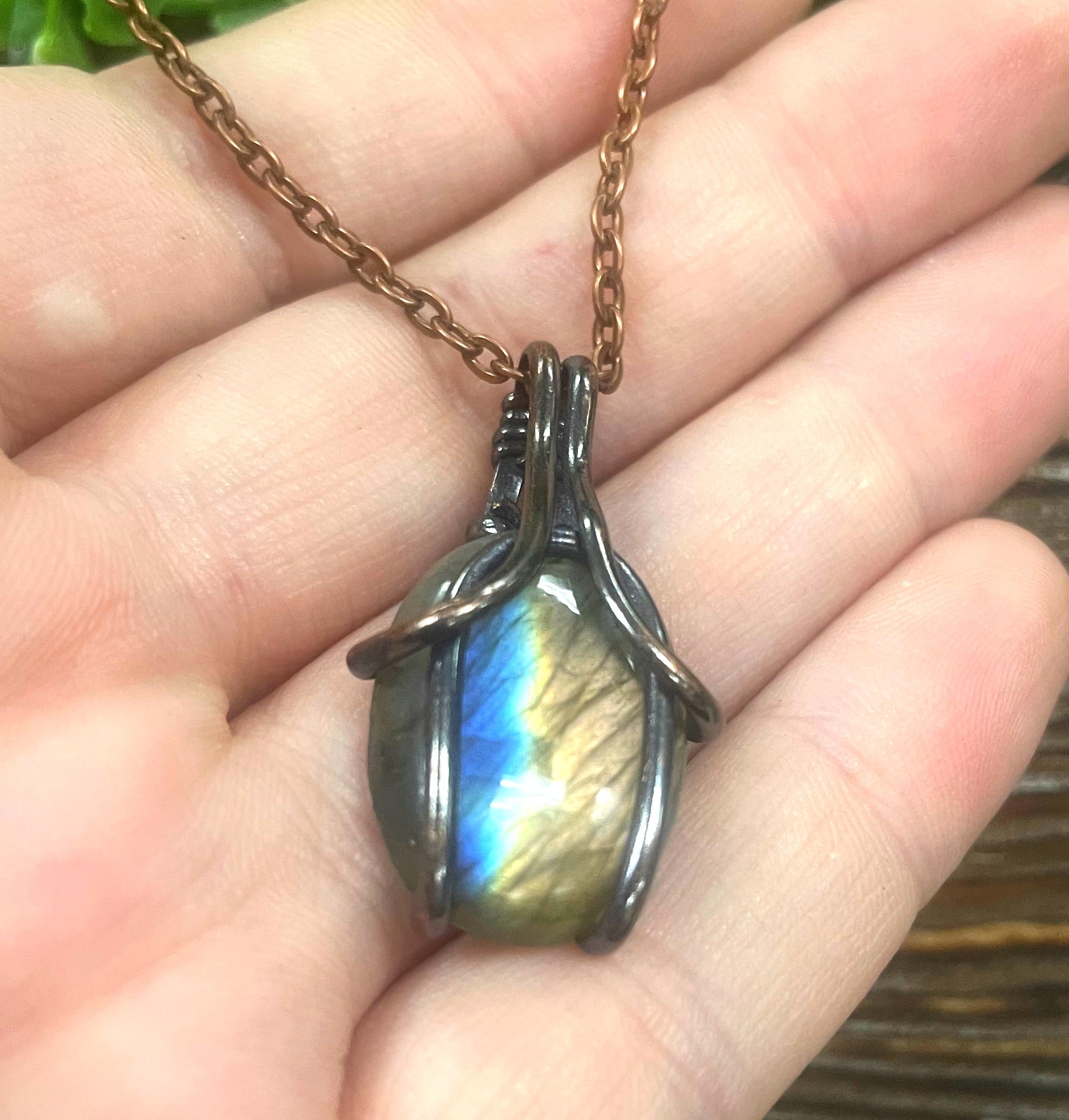 The craftsmanship of this pendant is truly remarkable. The oxidized copper wire wrapping not only enhances the beauty of the labradorite but also gives it an antique look that is both timeless and trendy. Each piece is left unsealed to maintain its unique character, and the polished finish adds a stunning touch that catches the light beautifully.