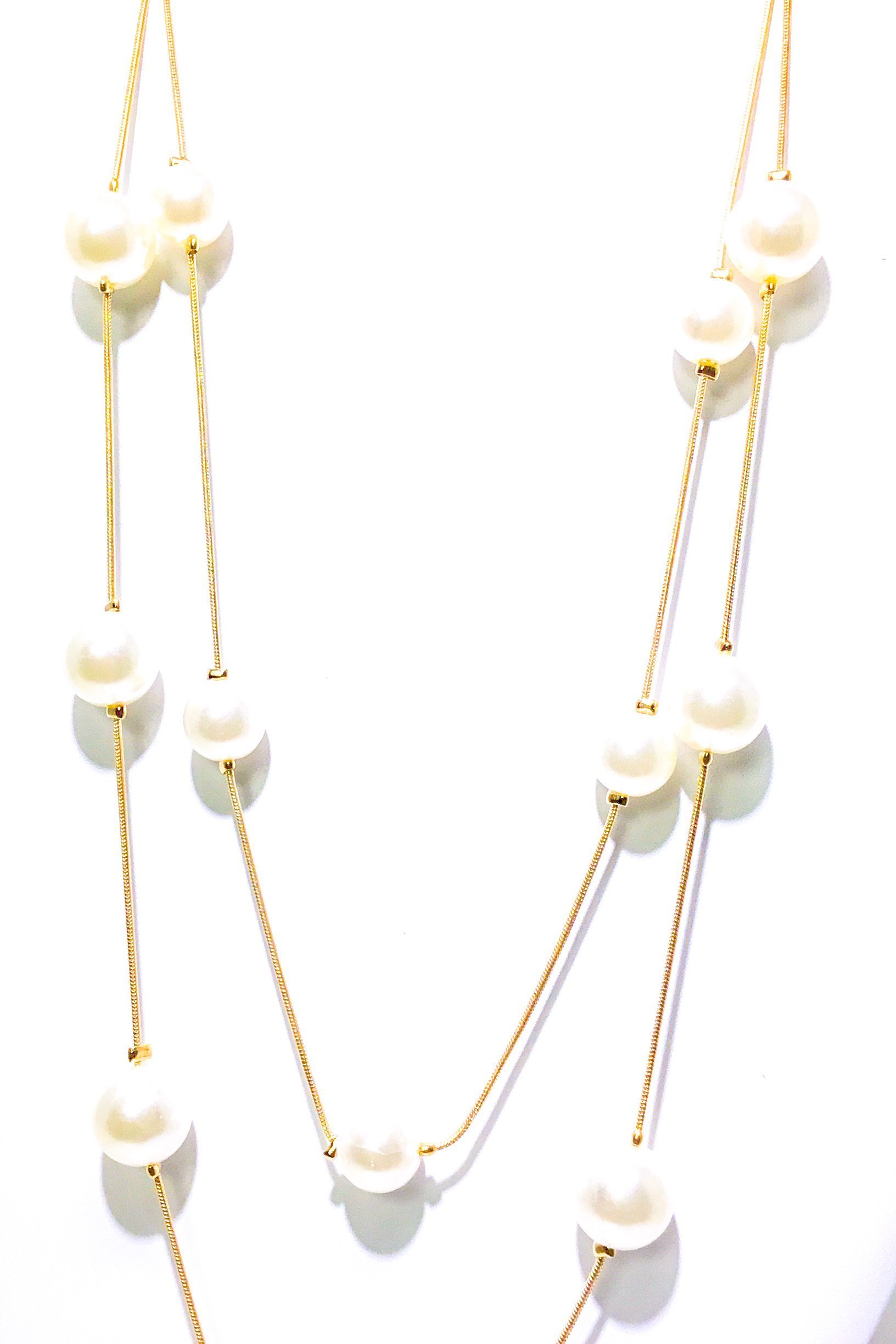 Faith & Pearls Necklace featuring a double strand of simulated pearls in a gold finish, perfect for special occasions.
