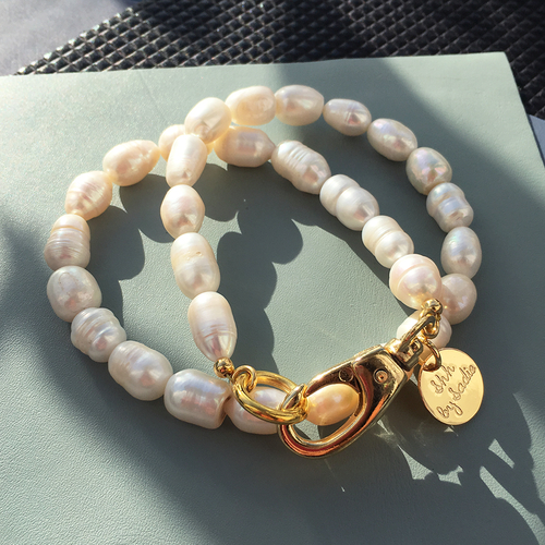 Chunky shimmering freshwater pearls combined with a large gold hardware clasp.
