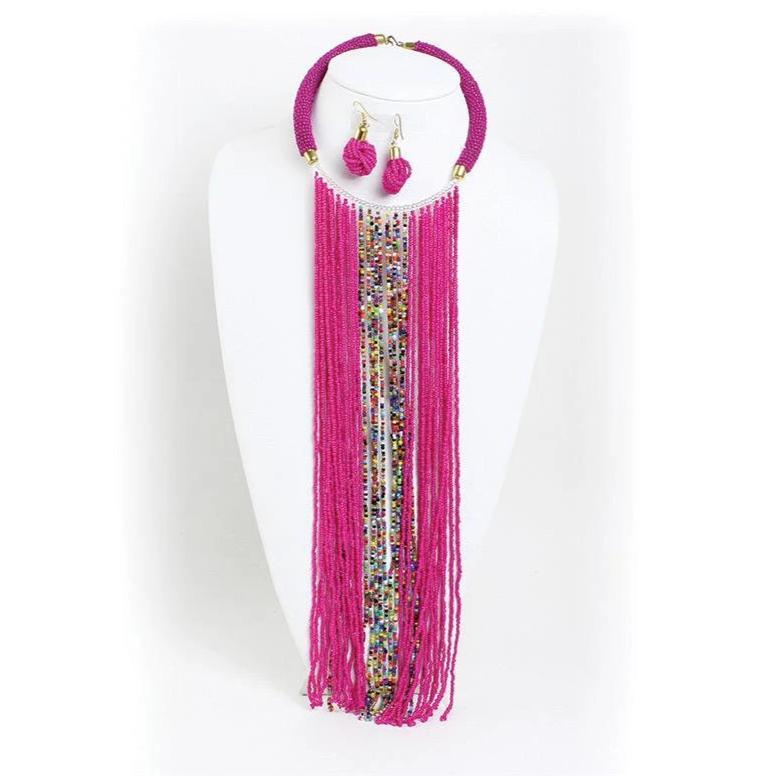 A vibrant pink beaded long necklace featuring Maasai beads with cascading fringe and matching earrings.