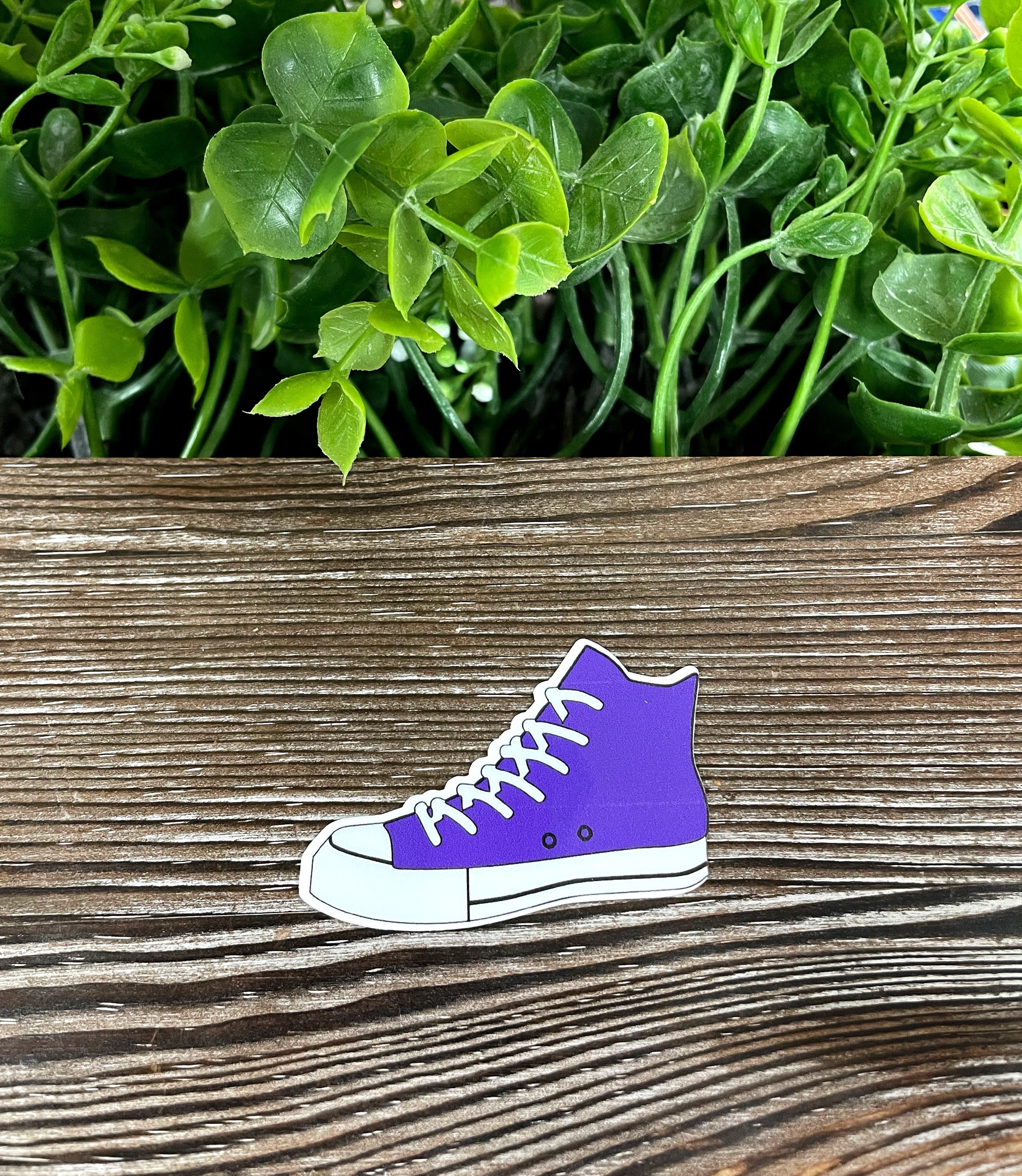 Introducing our Purple High Top Shoes Sticker, a fun and stylish way to express your personality! These die cut stickers are perfect for adding a unique touch to your belongings, whether it's your notebook, phone, window, or water bottle. Made from high-quality vinyl, our stickers are designed to withstand the elements, thanks to a water-resistant laminate coating that ensures durability and longevity.