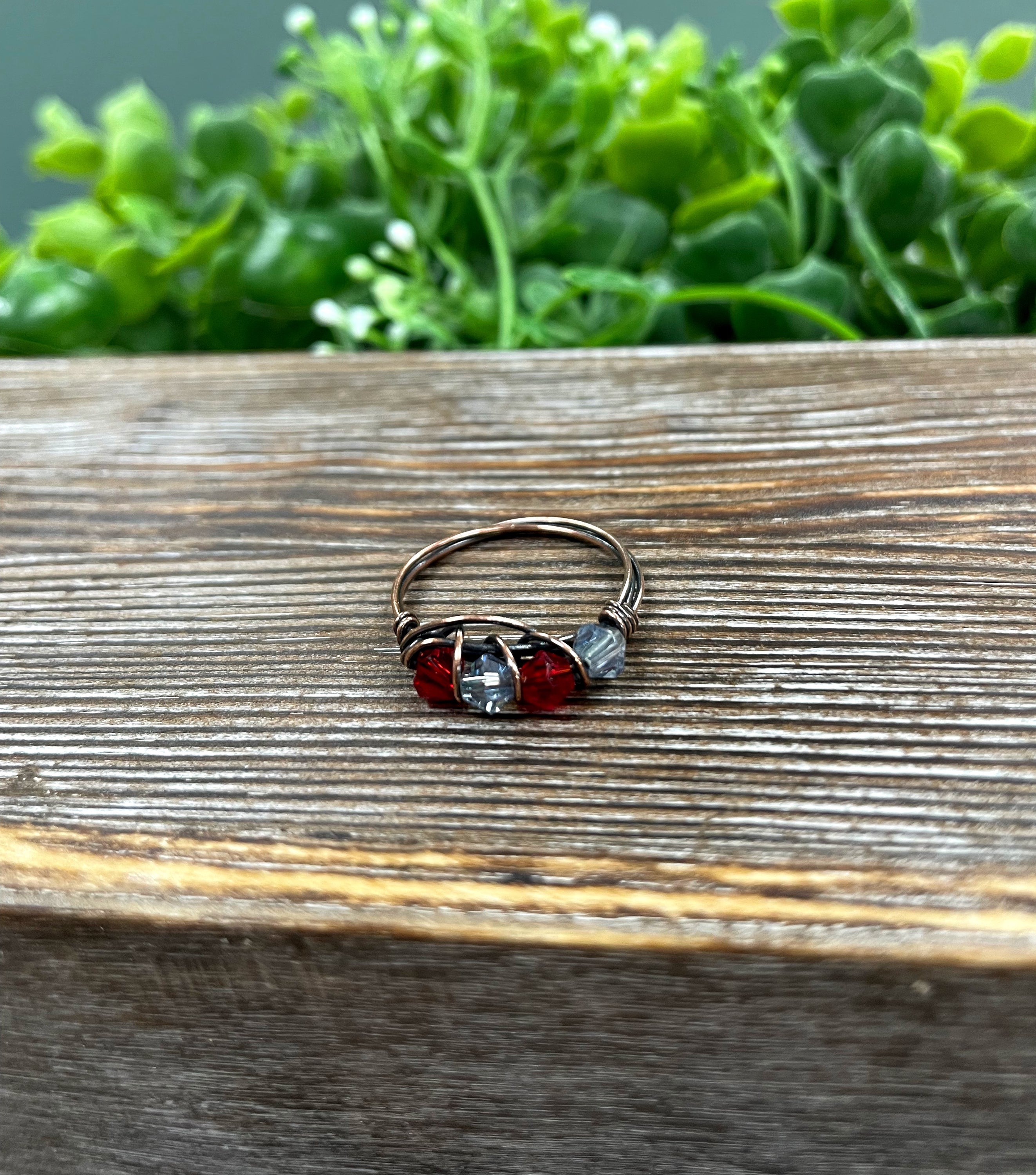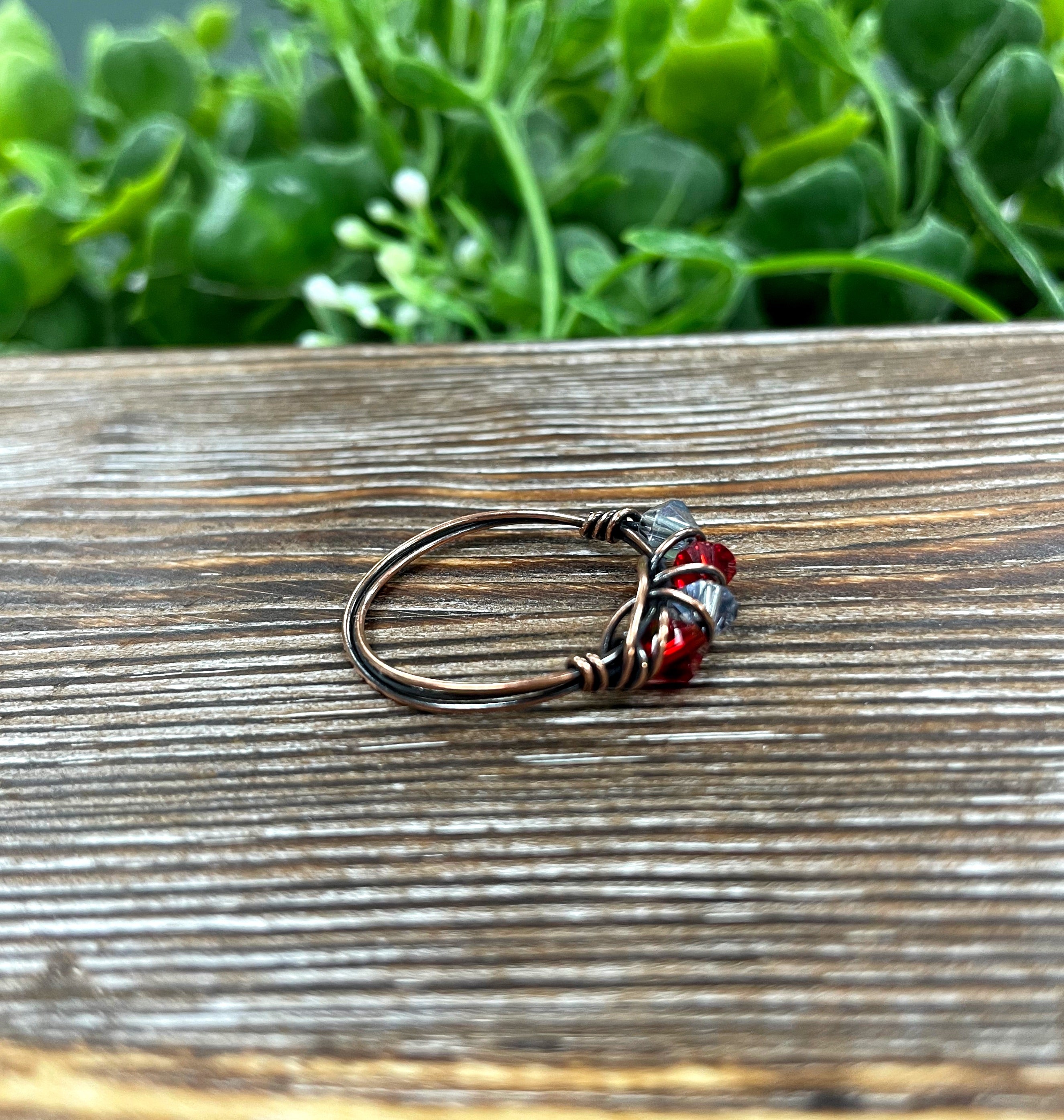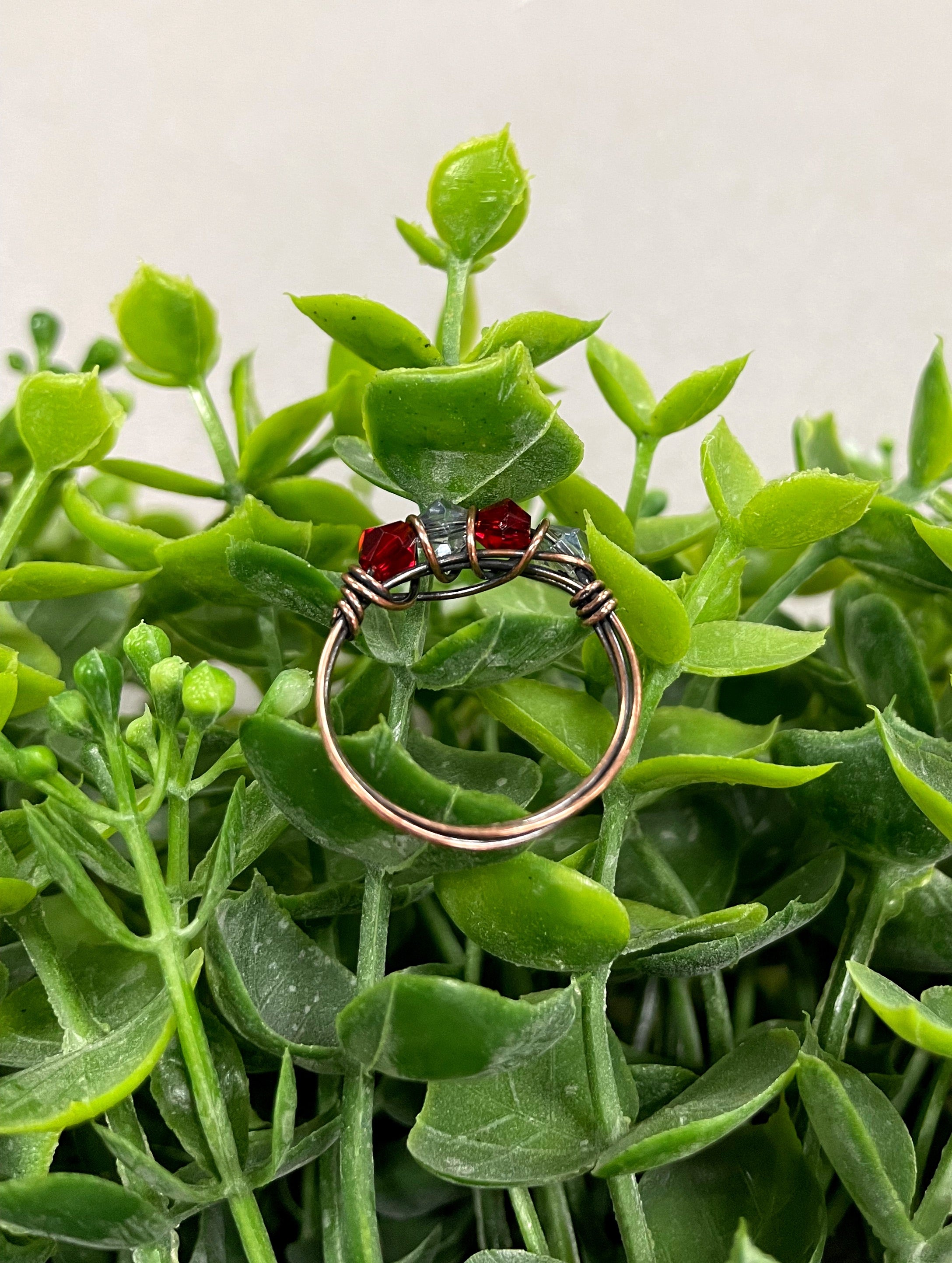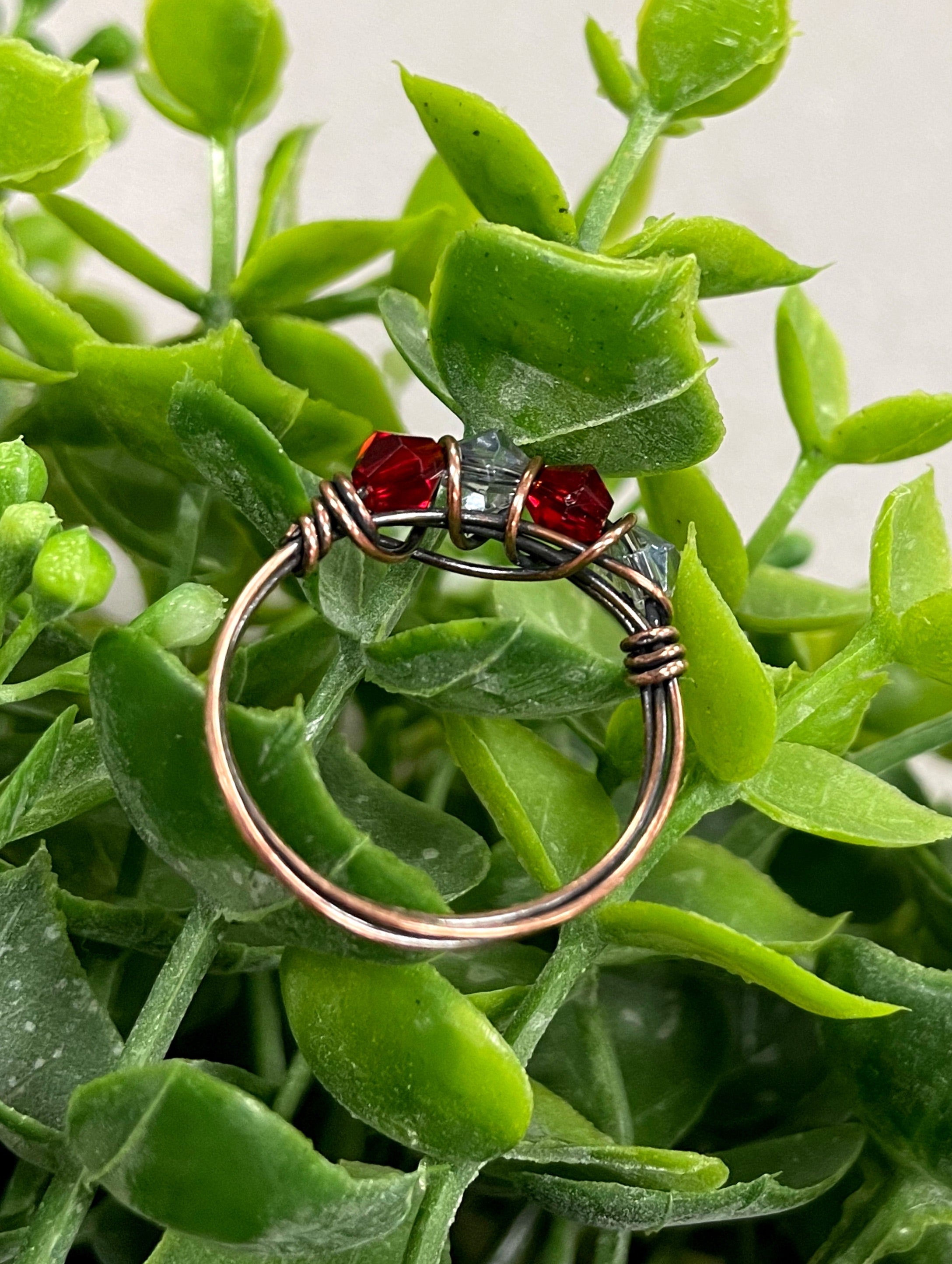 The Red and Grey Glass Crystal Wire Wrapped Ring is a stunning piece of jewelry that combines elegance and artistry. This handcrafted ring features beautiful red and grey glass beads that are intricately wrapped in oxidized copper wire, creating a unique and eye-catching design. The use of glass beads adds a touch of color and sophistication, making it a perfect accessory for any outfit.