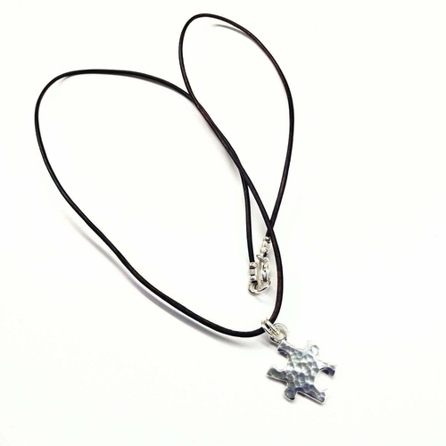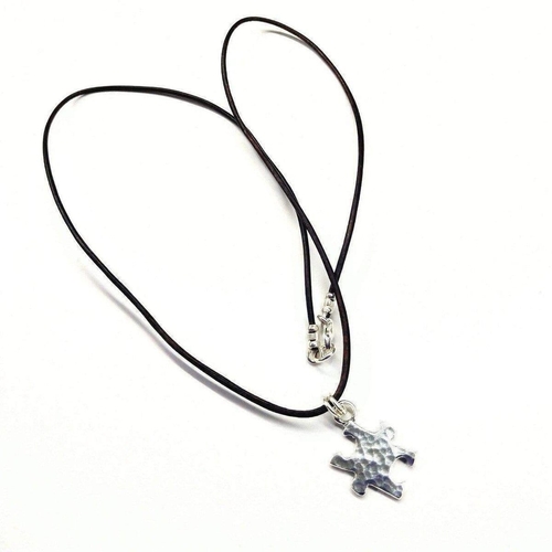Introducing our stunning Sterling Silver Autism Awareness Puzzle Piece Leather Necklace, a beautiful handcrafted piece that not only showcases your style but also your support for autism awareness. This unique necklace features a small, dime-sized sterling silver puzzle piece pendant, which is a symbol of the autism community. The pendant is delicately hammered, giving it a sparkly finish that catches the light beautifully.