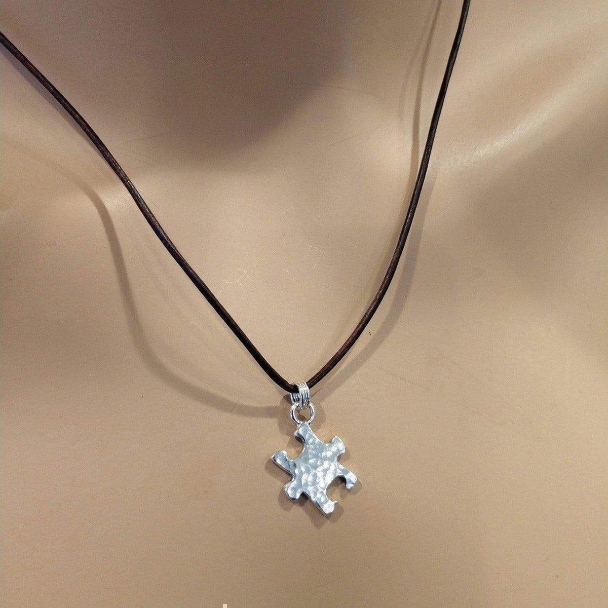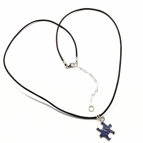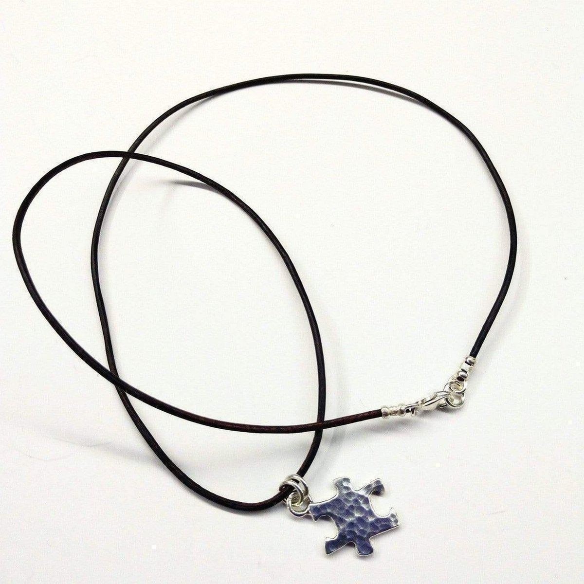 Sterling silver autism awareness puzzle piece necklace on a leather cord, showcasing its unique design and craftsmanship.