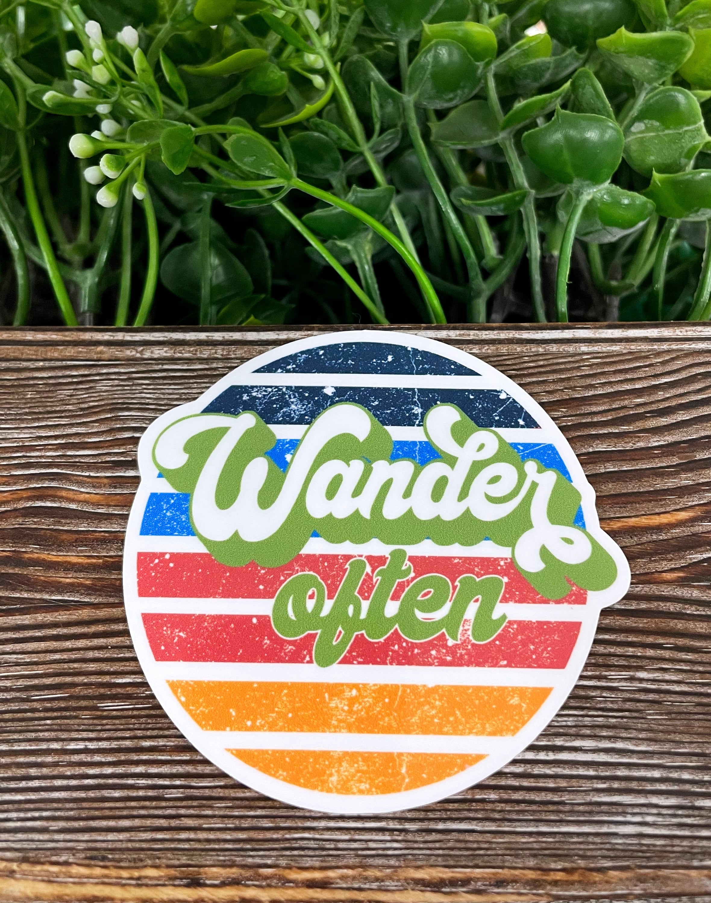 A vibrant die cut vinyl Travel Sticker featuring the phrase 'Wander Often', perfect for personalizing various surfaces.