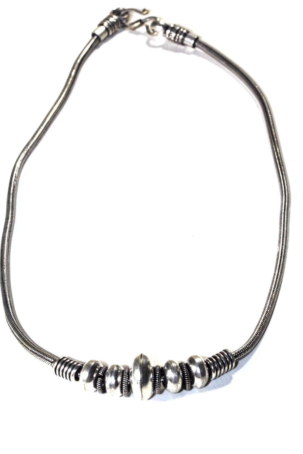 The Warrior Tribal Necklace is a stunning piece from our exclusive tribal collection, designed to elevate your accessory game. This necklace features a unique combination of coil bead charms and roundel silver tone disk charms that slide effortlessly along a smooth snake style chain. Whether you wear it alone for a simple and elegant look or stack it with your other delicate pieces for a chic and trendy feel, this necklace is sure to make a statement.