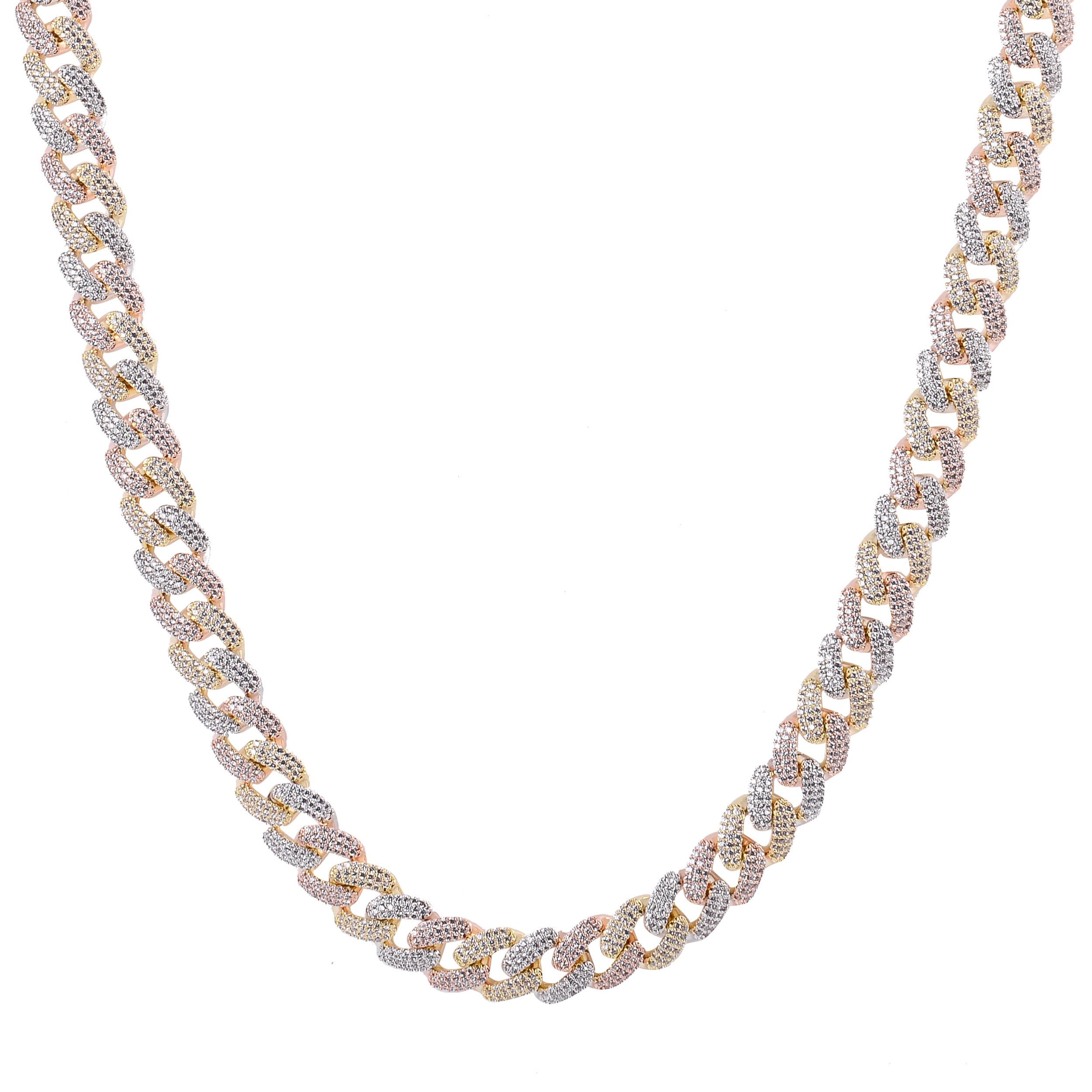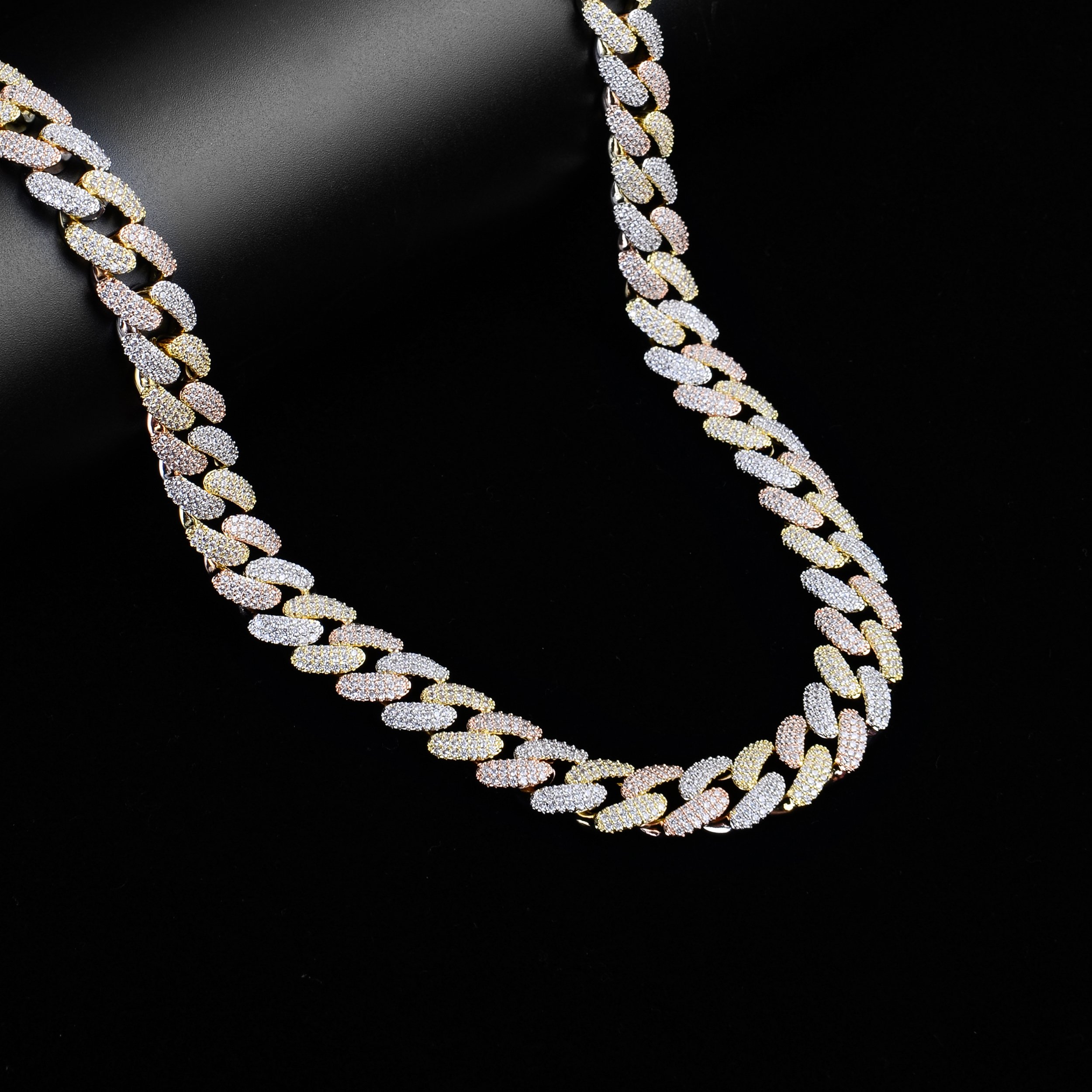 The chain is made from high-quality brass, featuring a TRI-Color and Rose Gold finish that adds a unique touch to its overall design. This combination of colors not only enhances the visual appeal of the chain but also allows it to pair well with other jewelry pieces. The craftsmanship involved in creating this chain is evident, as each link is prong set by hand, ensuring that every stone is securely held in place. This meticulous attention to detail is what sets the COLT Cuban Chain apart from other jewelry options on the market.