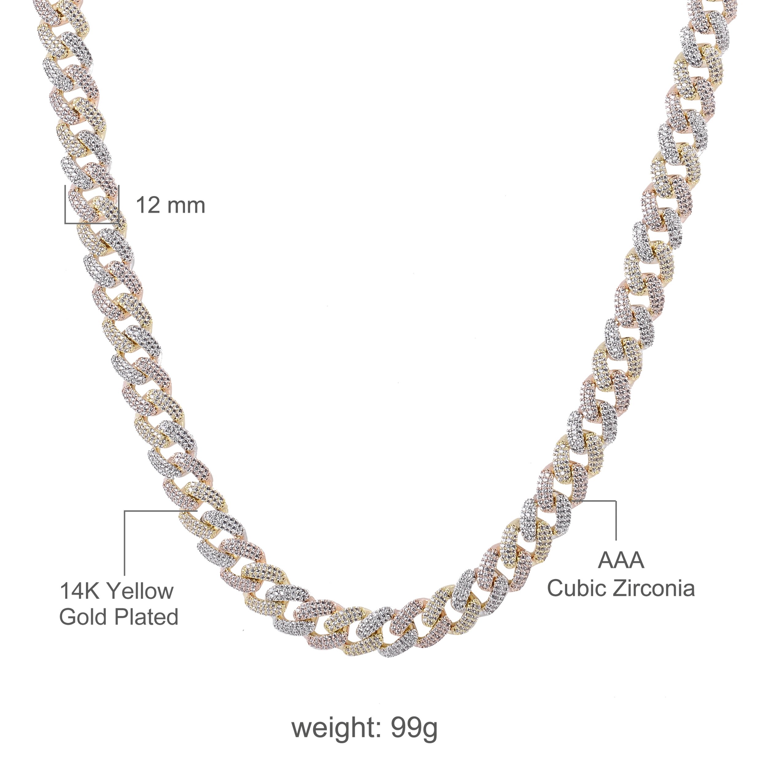 In summary, the COLT 12MM Cuban Chain is a luxurious and stylish accessory that features Grade AAA Cubic Zirconia stones, a hand-set prong design, and a beautiful TRI-Color and Rose Gold finish. Its bold 12 MM width and comfortable 18 to 20-inch length make it suitable for various occasions. Each chain is individually wrapped for protection, ensuring that it arrives in perfect condition. Made in China with attention to detail, this chain is a must-have for anyone looking to elevate their jewelry collection.