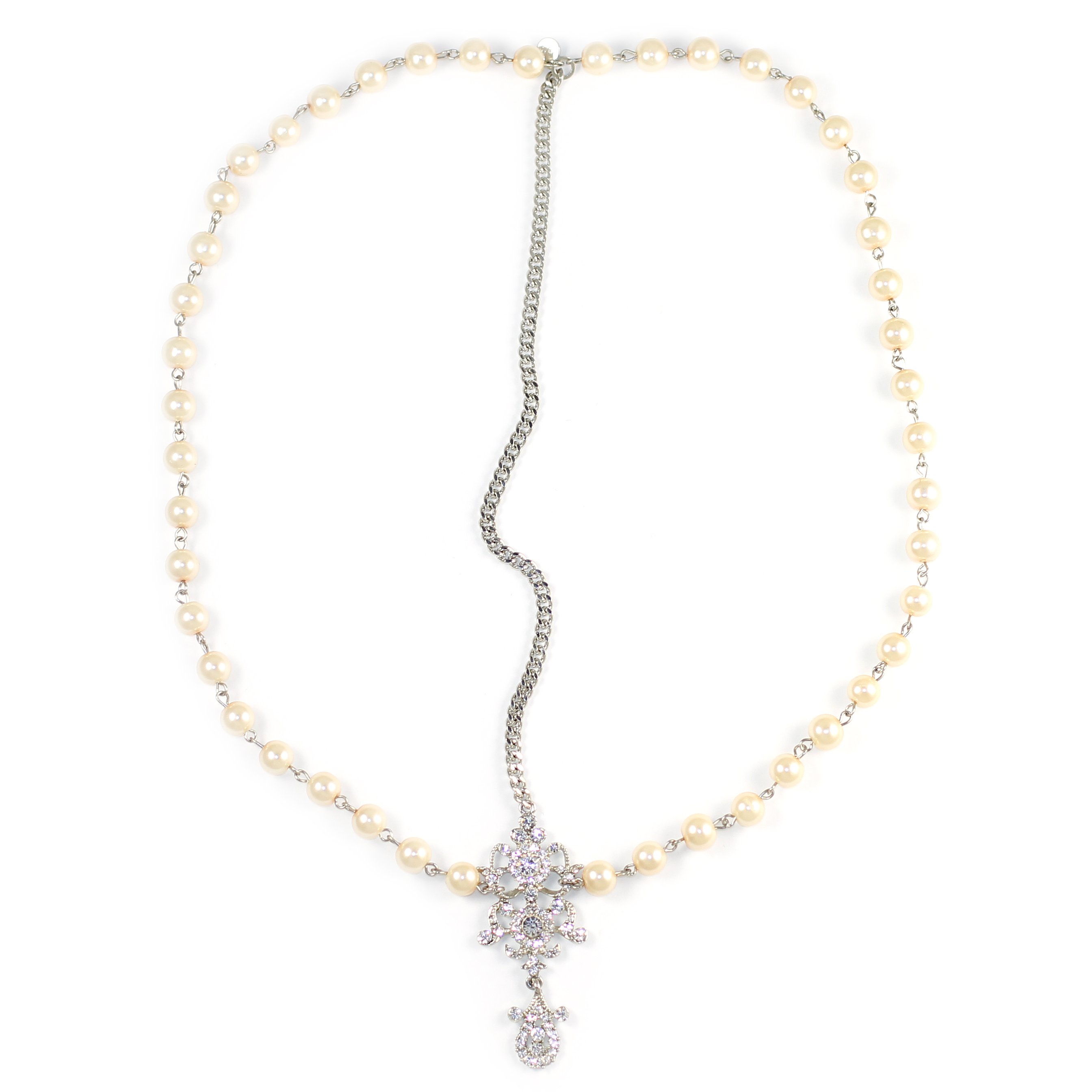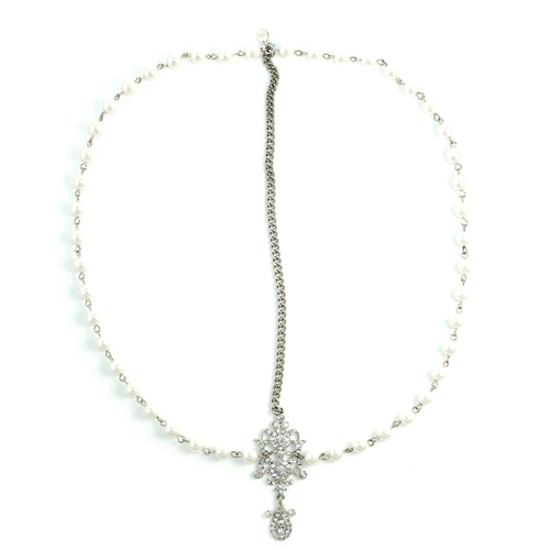 Draping Pearls Chain Headpiece featuring simulated pearls and Swarovski crystals, elegantly draping chains, and a central crystal pendant.