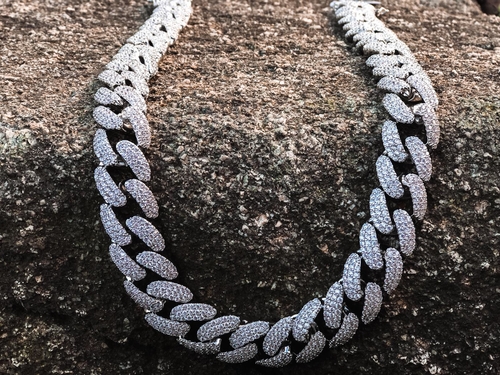The STALLION 18 MM Cuban Chain is a stunning piece of jewelry that embodies luxury and craftsmanship. This chain is meticulously crafted with solid Cuban links, making it a perfect accessory for those who appreciate high-quality jewelry. The chain is adorned with Grade AAA cubic zirconia, which adds a brilliant sparkle that catches the eye and elevates any outfit. Each cubic zirconia stone is prong set by hand, ensuring that every piece is unique and of the highest quality. This attention to detail is what sets the STALLION chain apart from other jewelry options on the market. The chain is available in various lengths, ranging from 18 inches to 24 inches, allowing you to choose the perfect fit for your style. Weighing between 210 to 290 grams, this chain is substantial enough to make a statement without being overly heavy. The STALLION chain is made from brass (copper) metal, which not only provides durability but also enhances the overall aesthetic of the piece. Each chain is individually poly bag wrapped, ensuring that it arrives in pristine condition, ready to be worn or gifted. Whether you're dressing up for a special occasion or looking to add some flair to your everyday attire, the STALLION 18 MM Cuban Chain is the perfect choice. Its luxurious design and high-quality materials make it a must-have for any jewelry collection. This chain is not just an accessory; it's a statement piece that reflects your style and personality. Made in China, the STALLION chain showcases the skill and artistry of artisans who are dedicated to perfection in every piece they create. The Cuban link design is timeless and versatile, making it suitable for both casual and formal wear. Pair it with a simple t-shirt for a laid-back look or wear it with a suit for a more polished appearance. The STALLION chain is designed for those who appreciate the finer things in life and want to express their individuality through their accessories. With its luxurious appearance and exceptional craftsmanship, this chain is sure to turn heads and garner compliments wherever you go. Invest in the STALLION 18 MM Cuban Chain today and experience the perfect blend of style, quality, and luxury.