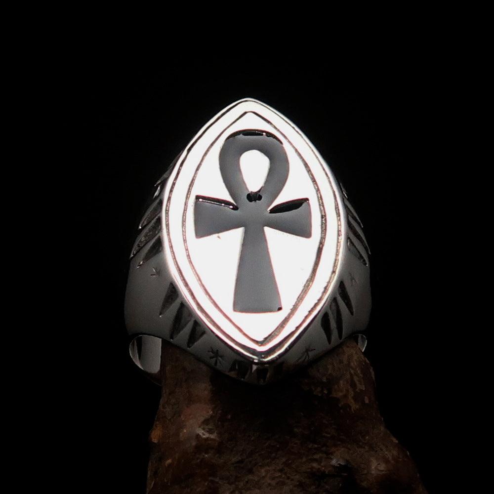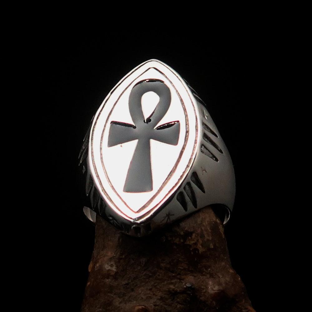 Introducing the Black Marquise Shaped Egyptian Ankh Cross Men's Ring, a stunning piece of jewelry crafted from solid sterling silver. This ring features a high-polished finish with a striking black enamel inlay, making it a perfect accessory for any occasion. The Ankh Cross, an ancient Egyptian symbol representing life and immortality, adds a unique touch to this elegant ring, making it not just a piece of jewelry but a statement of style and meaning.