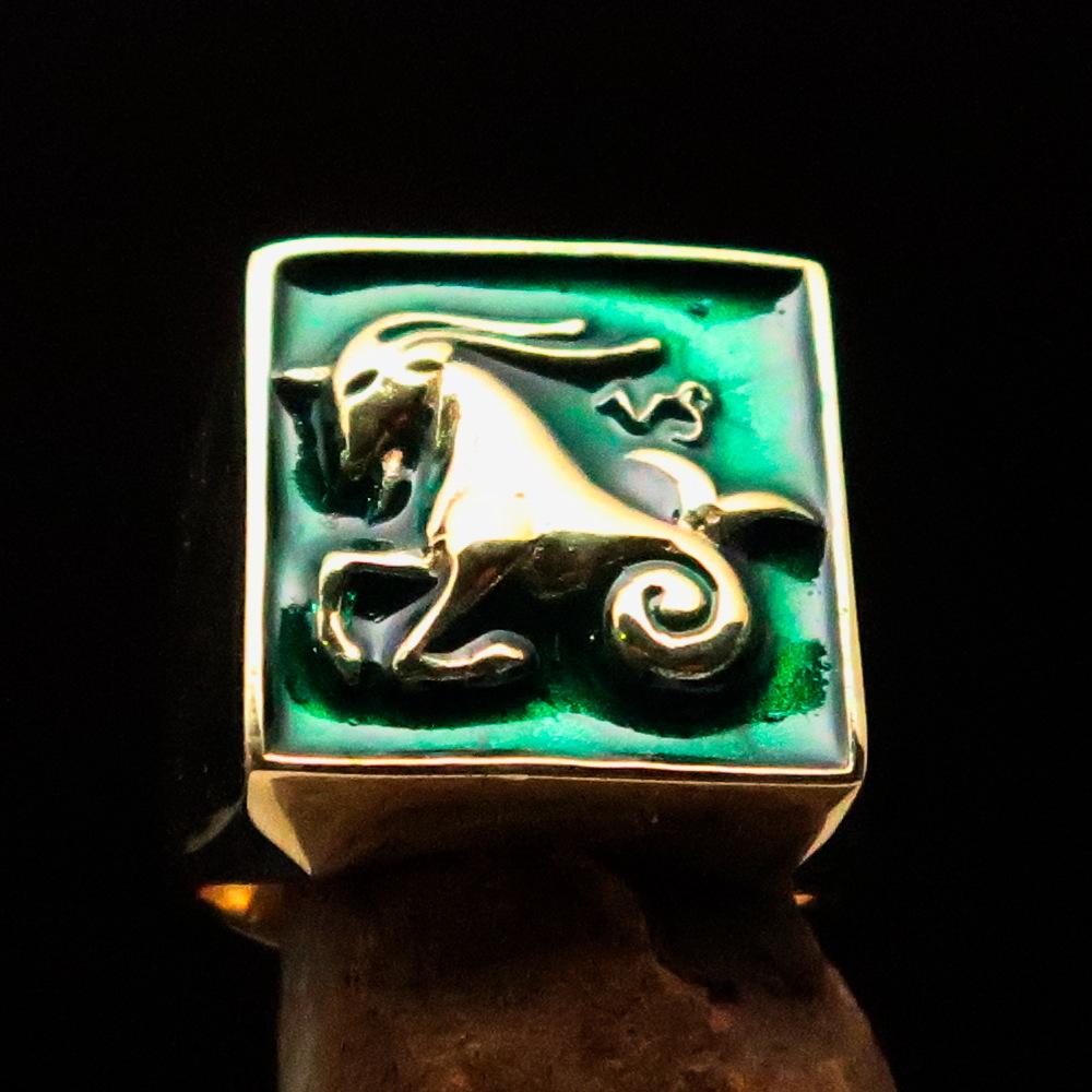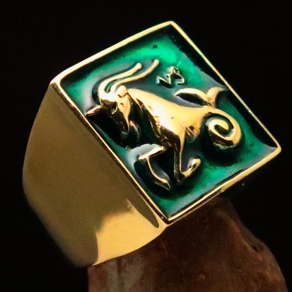 Introducing the Brass Men's Zodiac Ring Capricorn in Green, a stunning piece of jewelry that combines style and astrological significance. This solid brass ring features a high polished finish that enhances its aesthetic appeal, making it a perfect accessory for any occasion. The vibrant green enamel detailing adds a unique touch, representing the Capricorn zodiac sign beautifully.
