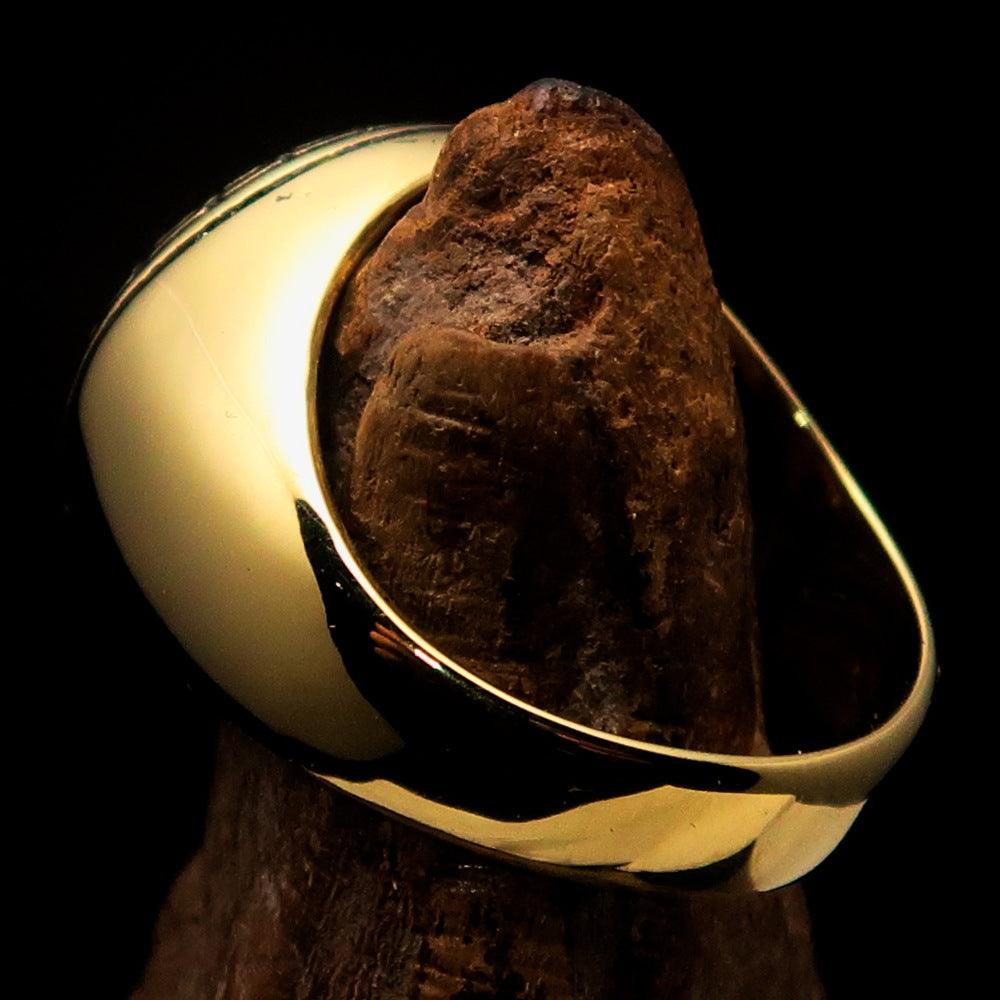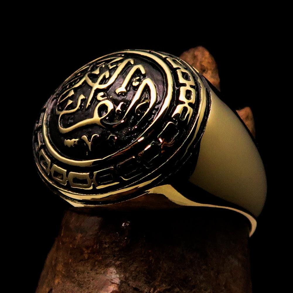 Introducing the Domed Men's Al Quran ul Kareem Muslim Pinky Ring, a stunning piece of jewelry that combines elegance with spiritual significance. Crafted from solid antiqued brass, this ring is designed to be both durable and stylish, making it a perfect accessory for any occasion. The antiqued finish gives it a unique character, ensuring that it stands out while also being a subtle nod to your faith.