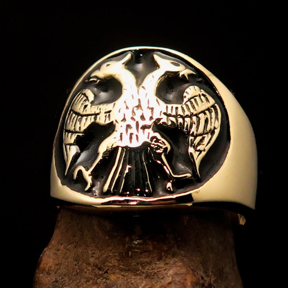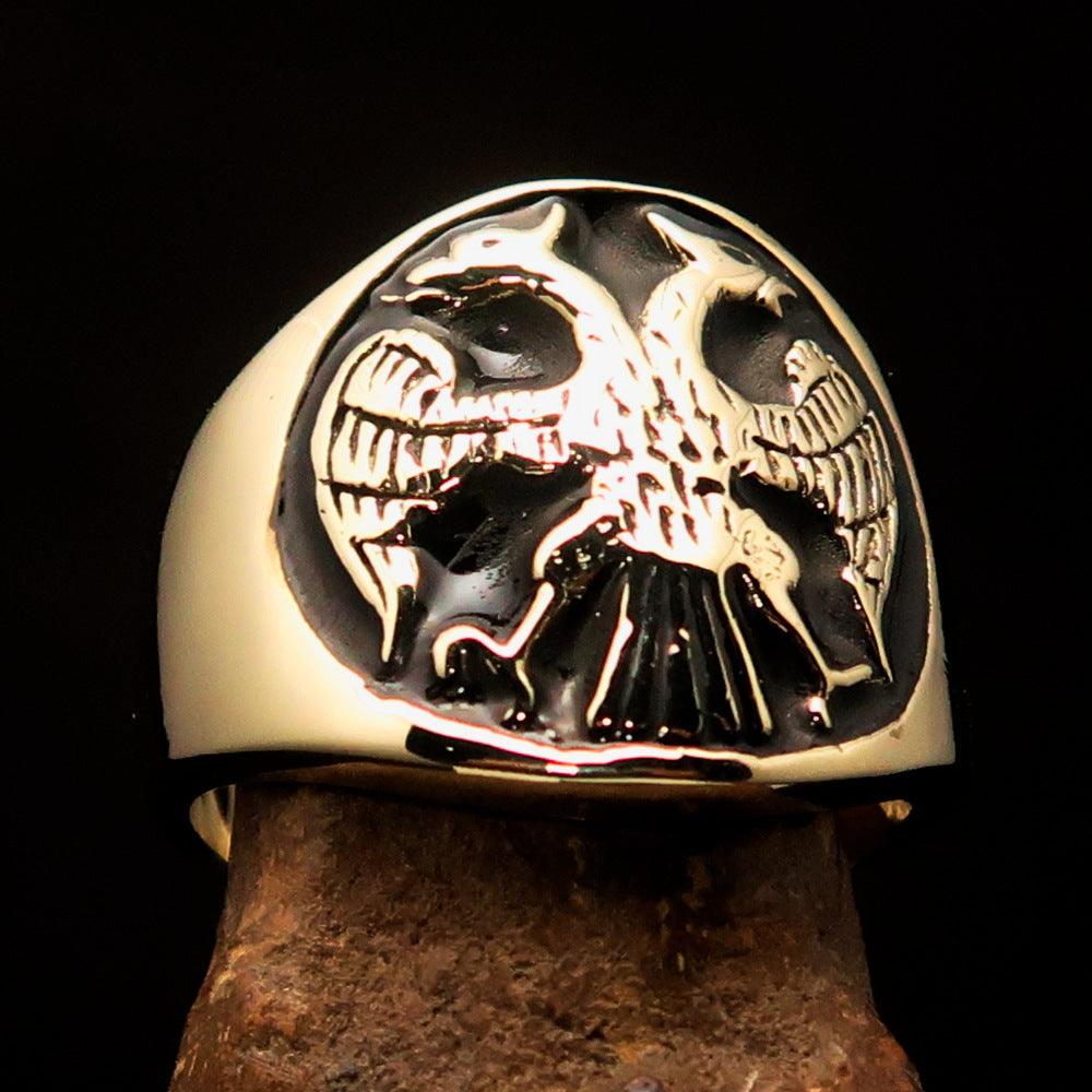 Introducing the Excellent Crafted Ancient Men's Black Twin Head Eagle Ring, a stunning piece of jewelry that embodies strength and power. This exquisite ring is meticulously crafted from high-quality solid brass, ensuring durability and a luxurious appearance. The unique design features twin eagle heads, a symbol of courage and resilience, making it a perfect accessory for those who appreciate bold and meaningful jewelry.