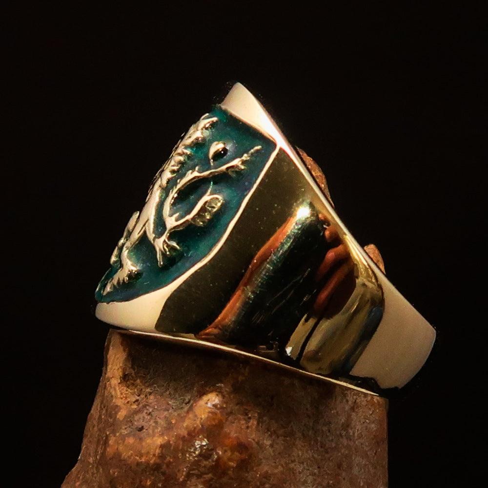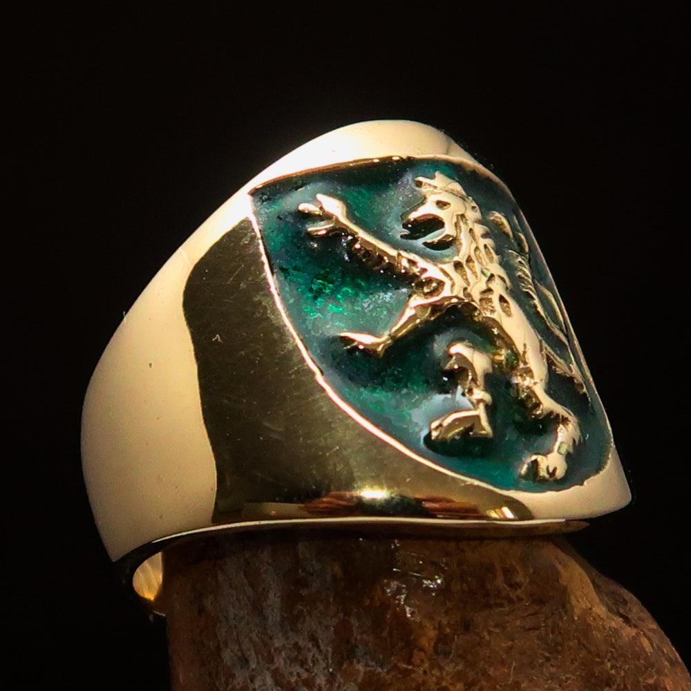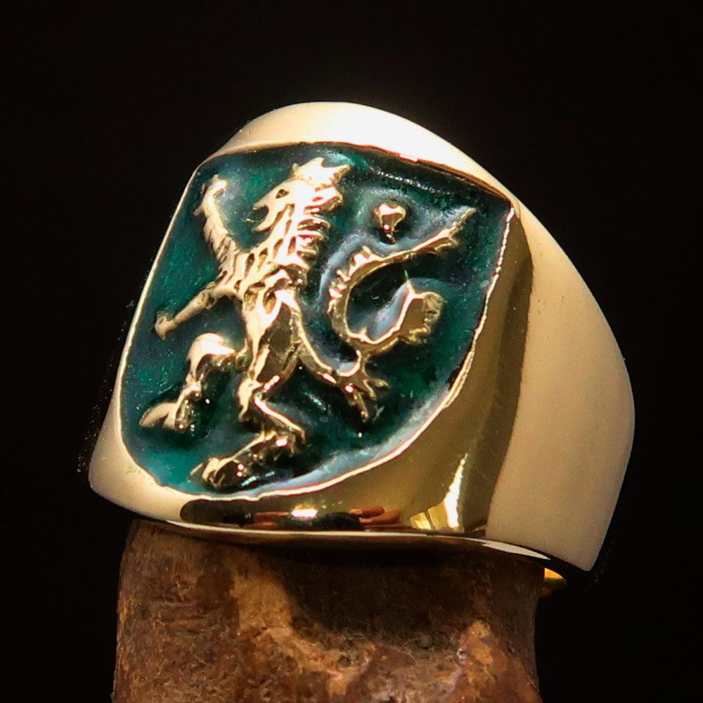 This stunning Men's Green Rampant Lion Ring is a true masterpiece, crafted with precision and attention to detail. Made from solid brass, it features a vibrant green enamel design of a rampant lion, symbolizing strength and courage. The ring is high polished, giving it a sleek and elegant look that is sure to catch the eye of anyone who sees it.