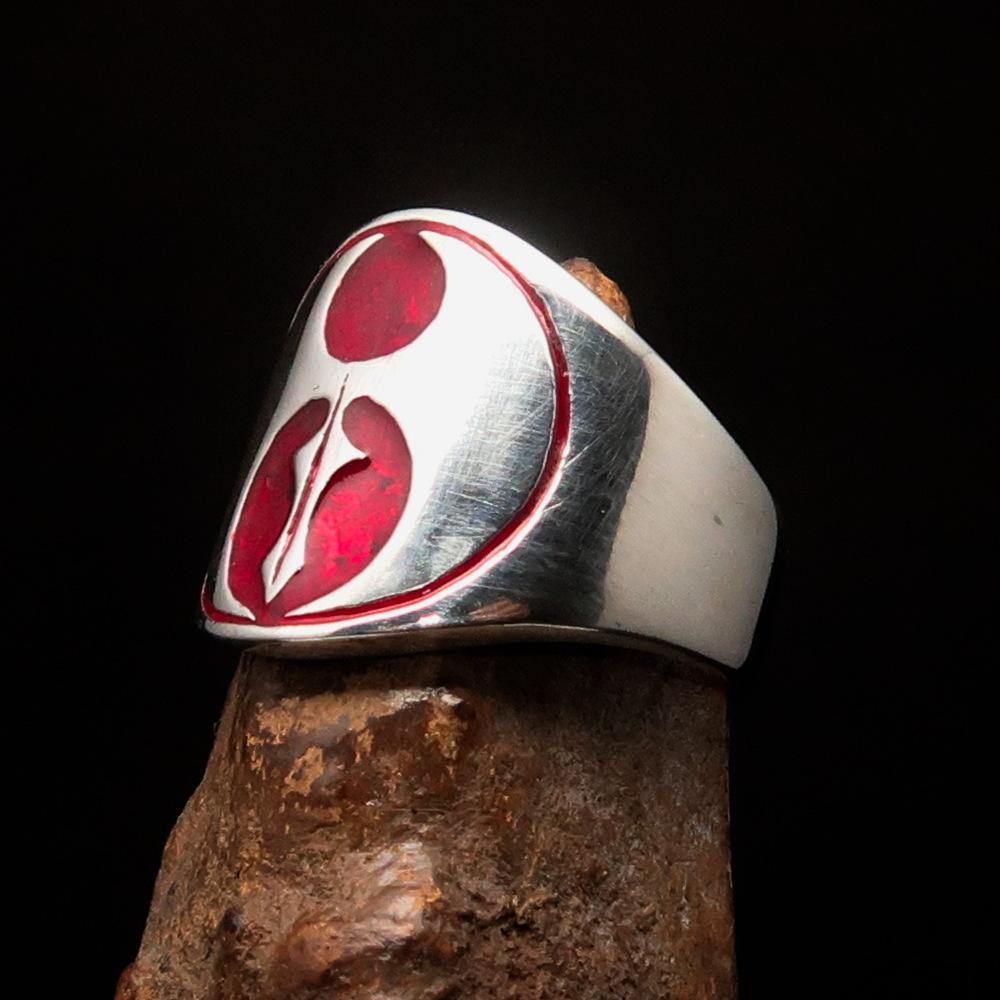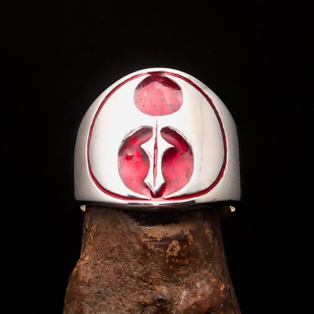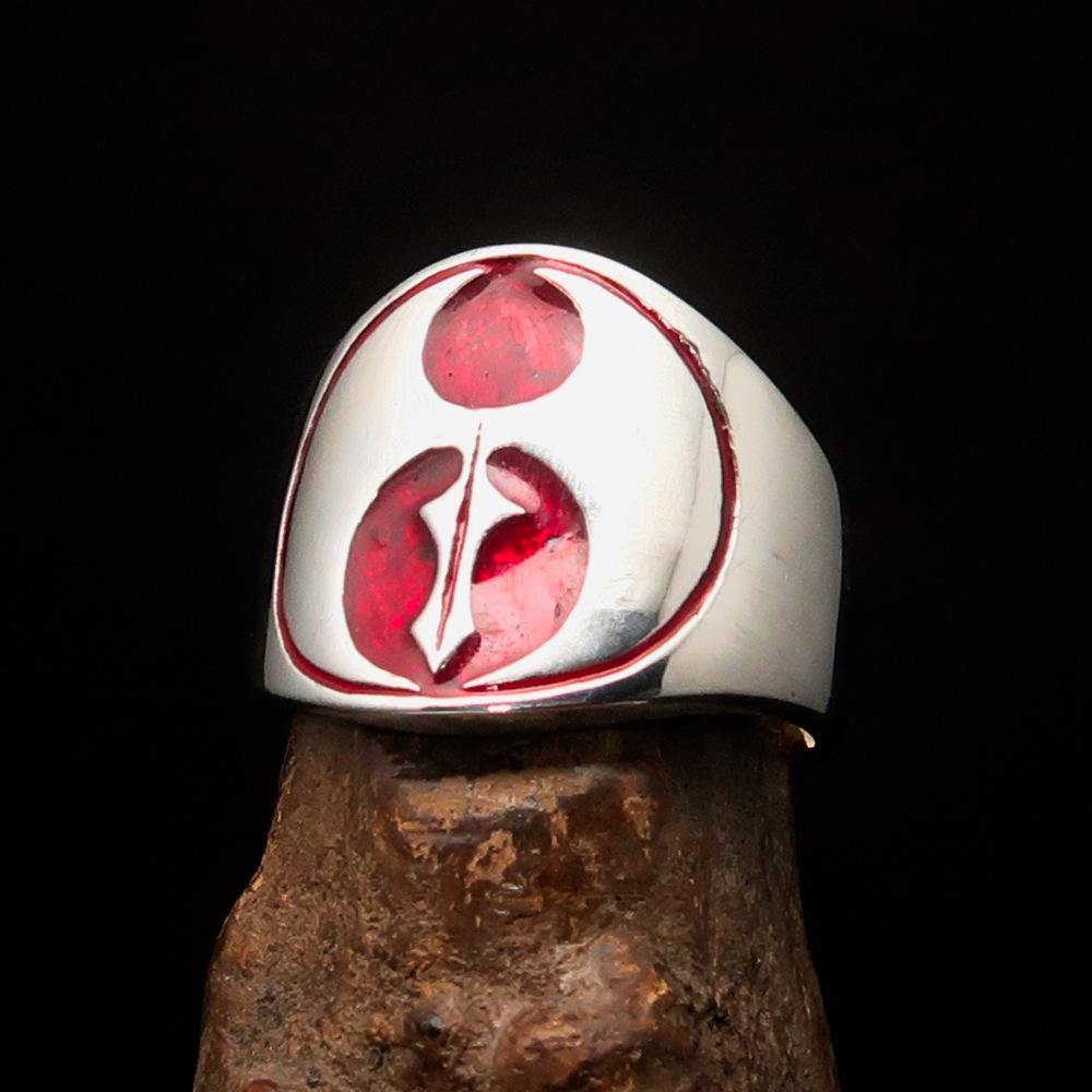 Men's Red Labrys Double Axe Ring made of solid sterling silver with high polish and red enamel detailing.