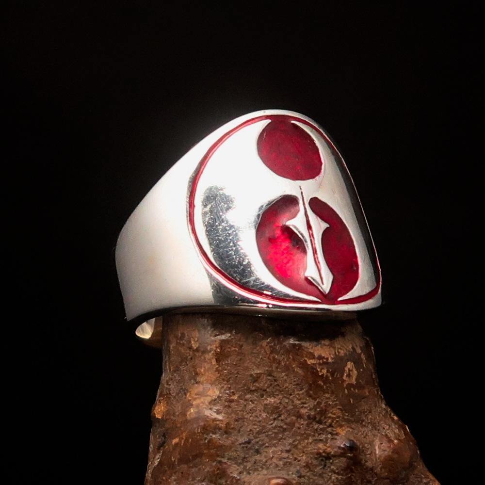 Introducing the Excellent Crafted Ancient Men's Red Labrys Double Axe Ring, a stunning piece of jewelry that combines artistry and craftsmanship. Made from solid sterling silver, this ring features a high-polished finish that enhances its beauty and durability. The striking red enamel detailing adds a unique touch, making it a perfect accessory for any occasion.