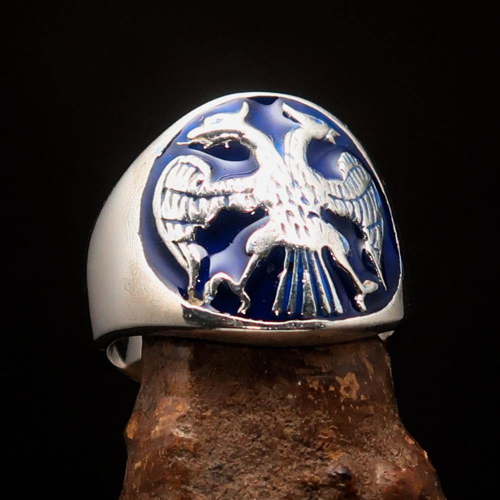 Excellent Crafted Ancient Men's Twin Head Eagle Ring in Blue, made of sterling silver with intricate twin head eagle design and polished enamel finish.