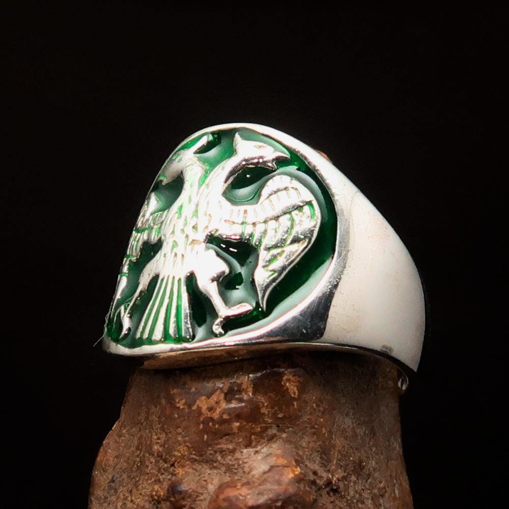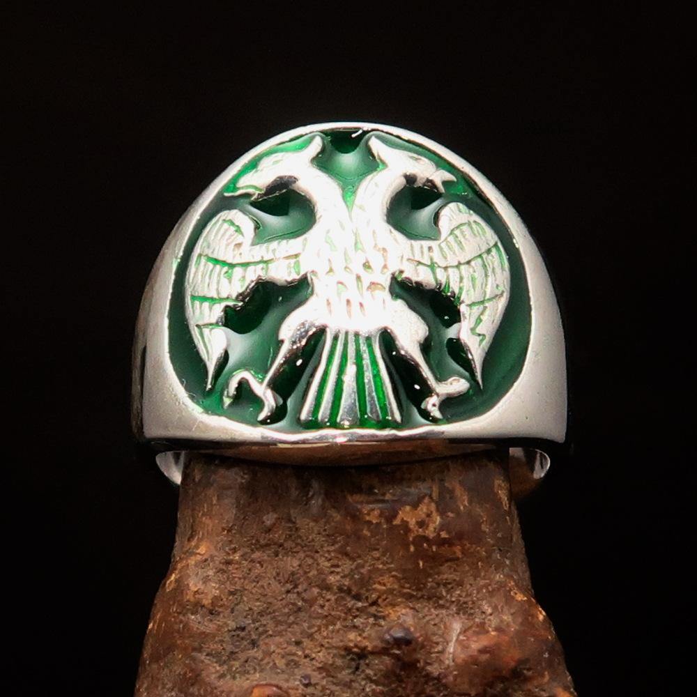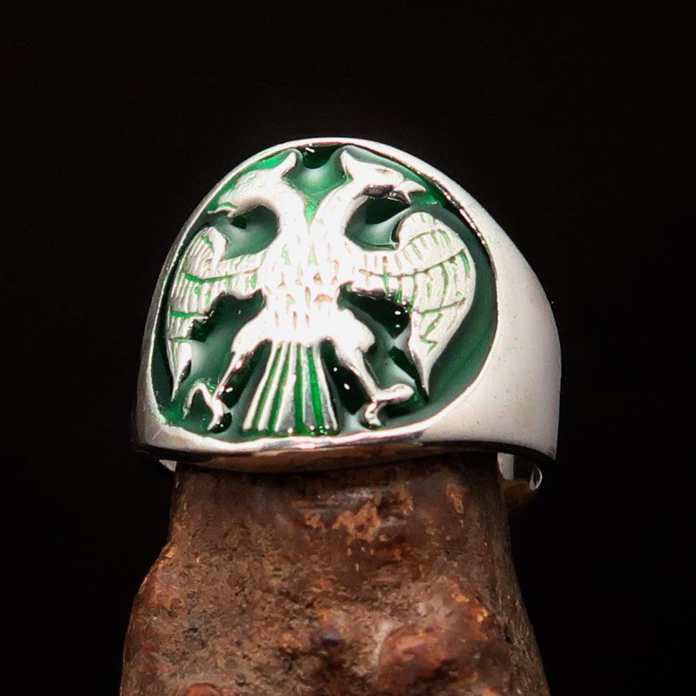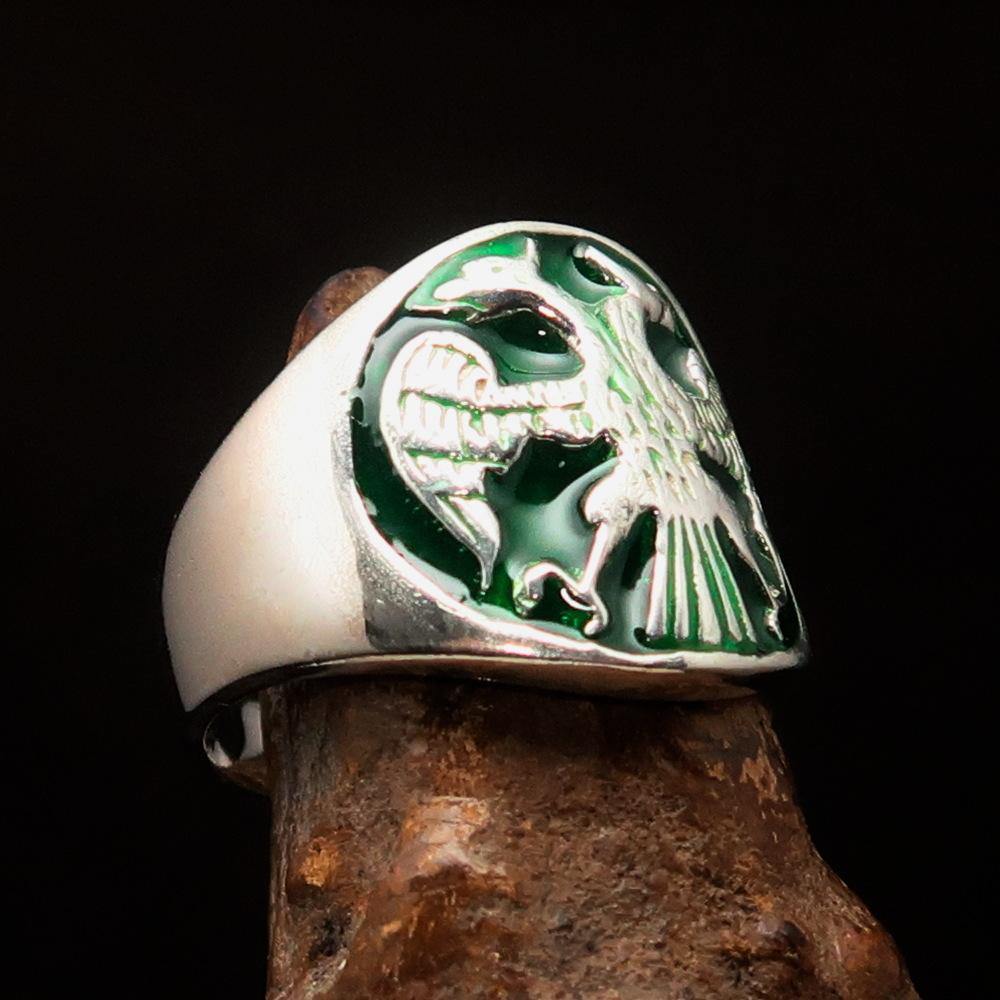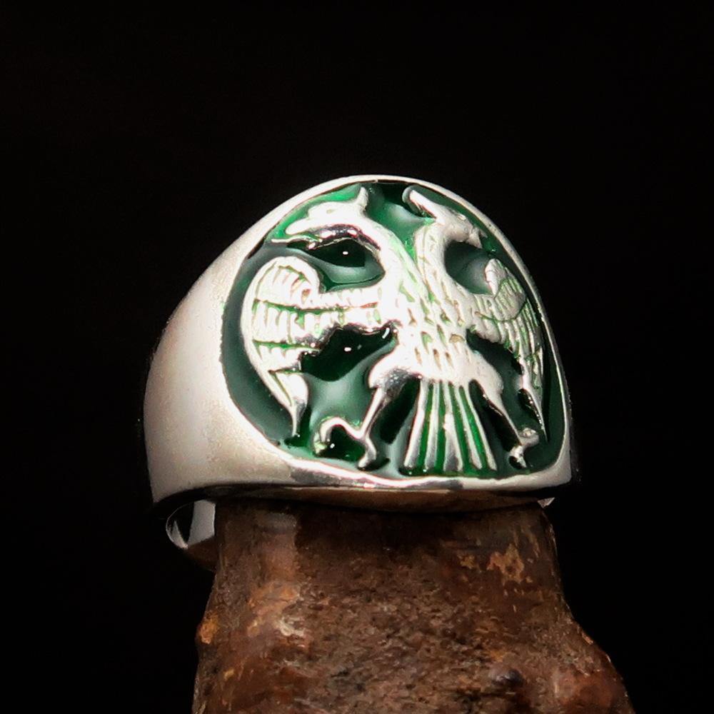 This Excellent crafted ancient Men's Twin Head Eagle Ring is not just a piece of jewelry; it is a statement of style and history. Made from high-quality solid Sterling Silver, this ring features a stunning high polished finish that enhances its beauty. The vibrant green enamel inlay adds a unique touch, making it a perfect accessory for any occasion.